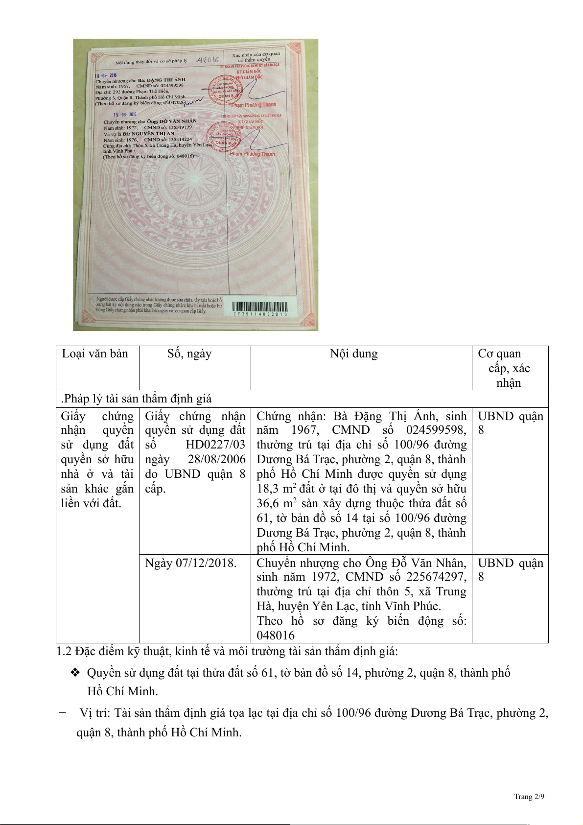 1.1 Pháp lý tài sản thẩm định giá: Trang 1/9 Loại văn bản Số, ngày Nội dung Cơ quan cấp, xác nhận