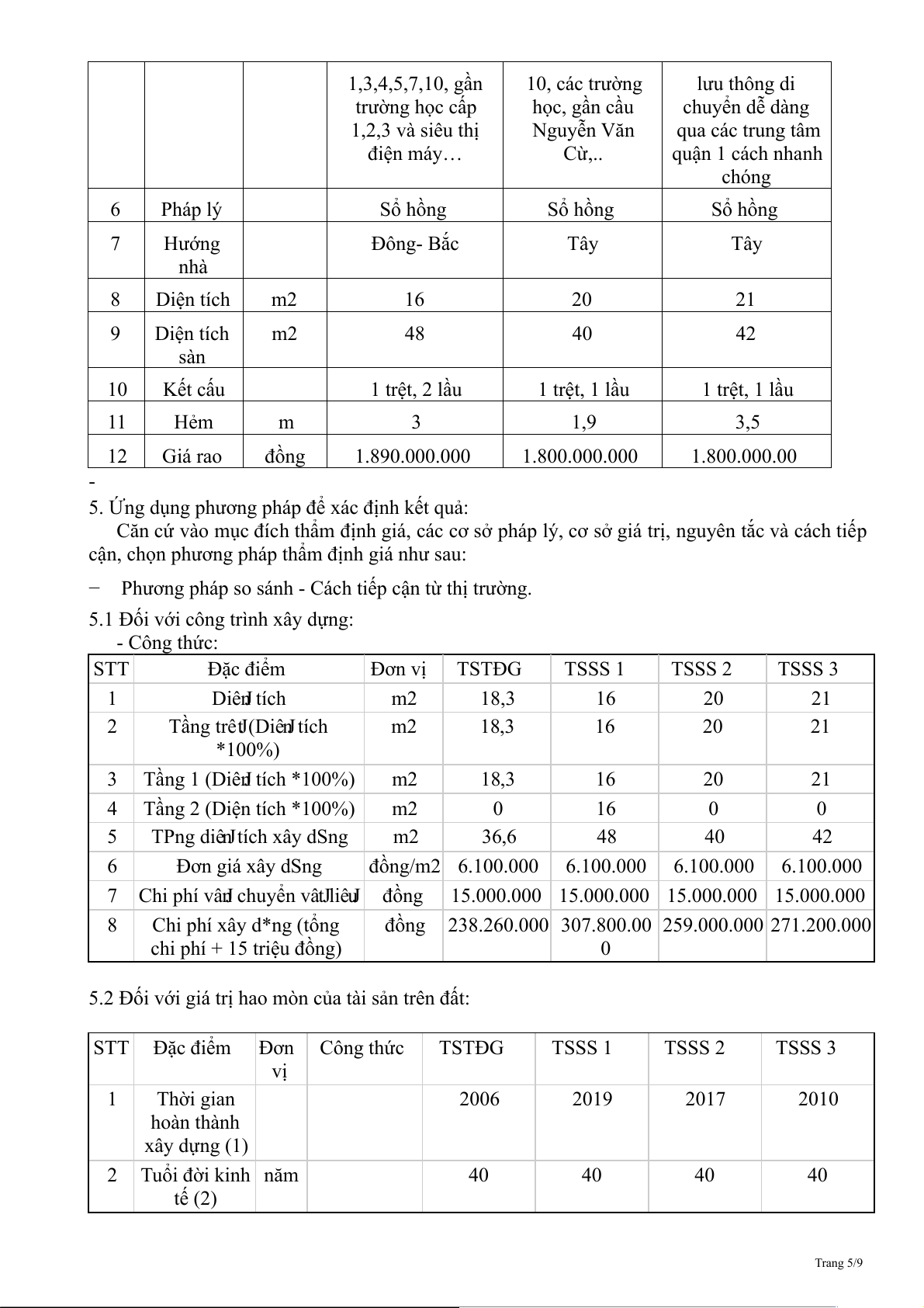 5.1 Đối với công trình xây dựng: - Công thức: STT Đặc điểm Đơn vị TSTĐG TSSS 1 TSSS 2 TSSS 3 1 Diê J n tích m2 18,3 16 20 21 2 Tầng trê Jt (Diê J n tích m2 18,3 16 20 21 *100%) 3 Tầng 1 (Diê J n tích *100%) m2 18,3 16 20 21 4 Tầng 2 (Diện tích *100%) m2 0 16 0 0 5 TPng diê J n tích xây dSng m2 36,6 48 40 42 6 Đơn giá xây dSng đồng/m2 6.100.000 6.100.000 6.100.000 6.100.000 7 Chi phí vâ J n chuyển vâ J t liê J u đồng