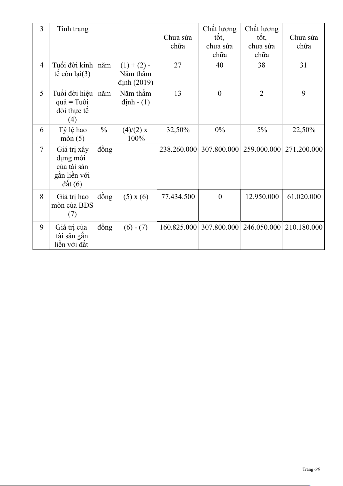 238.260.000 307.800.000 259.000.000 271.200.000 dựng mới của tài sản gắn liền với đất (6) 8 Giá trị hao đồng (5) x (6) 77.434.500 0 12.950.000 61.020.000 mòn của BĐS (7) 9 Giá trị của đồng (6) - (7)