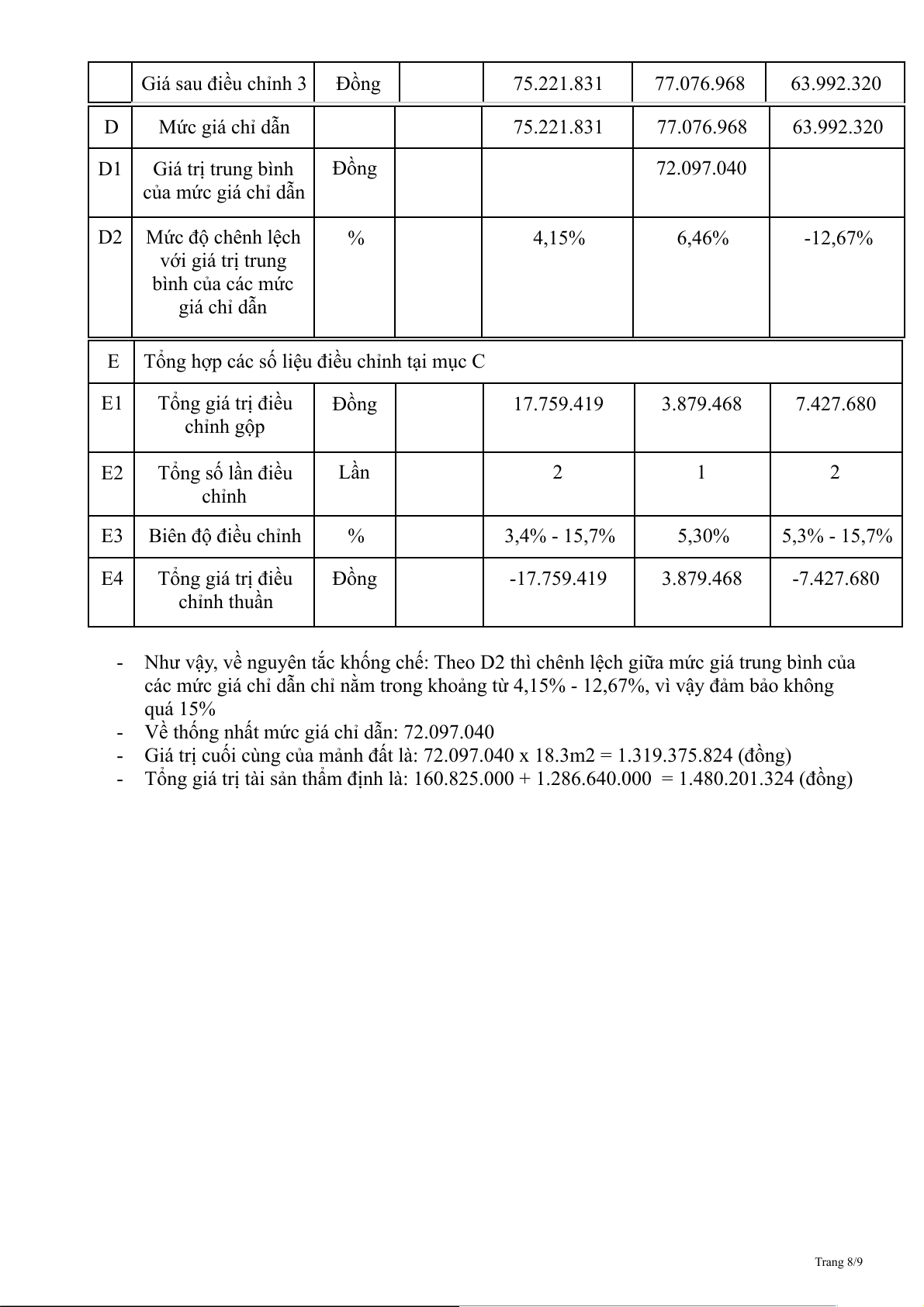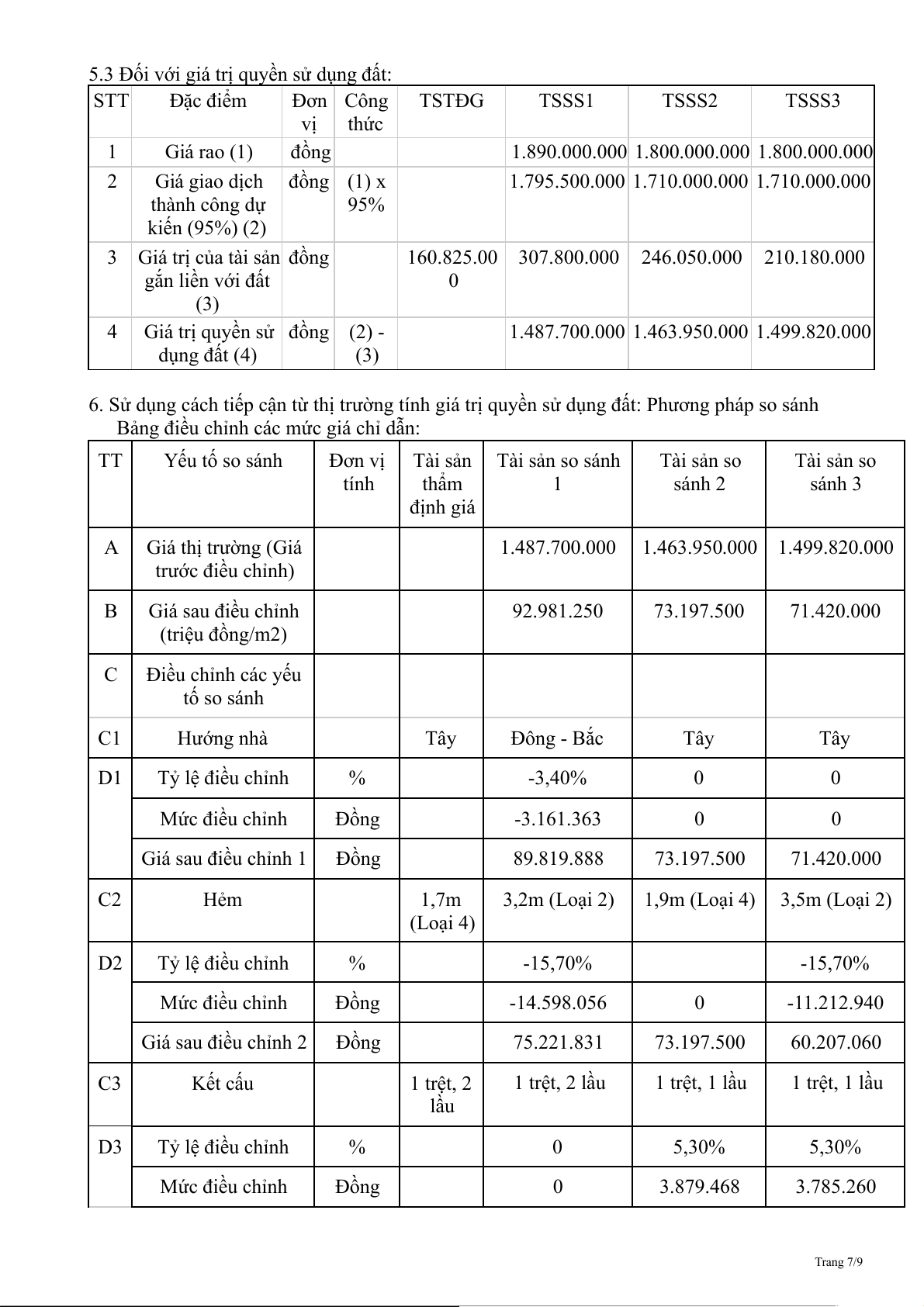 Bảng điều chỉnh các mức giá chỉ dẫn: TT Yếu tố so sánh Đơn vị Tài sản Tài sản so sánh Tài sản so Tài sản so tính thẩm 1 sánh 2 sánh 3 định giá A Giá thị trường (Giá 1.487.700.000 1.463.950.000 1.499.820.000 trước điều chỉnh) B Giá sau điều chỉnh 92.981.250 73.197.500 71.420.000 (triệu đồng/m2) C Điều chỉnh các yếu tố so sánh C1 Hướng nhà Tây Đông - Bắc Tây Tây D1 Tỷ lệ điều chỉnh % -3,40% 0 0 Mức điều chỉnh Đồng -3.161.363 0 0 Giá sau điều chỉnh 1 Đồng 89.819.888 73.197.500 71.420.000 C2 Hẻm 1,7m 3,2m (Loại 2) 1,9m (Loại 4) 3,5m (Loại 2) (Loại 4) D2 Tỷ lệ điều chỉnh % -15,70% -15,70% Mức điều chỉnh Đồng -14.598.056 0 -11.212.940 Giá sau điều chỉnh 2 Đồng 75.221.831 73.197.500 60.207.060 C3 Kết cấu 1 trệt, 2 1 trệt, 2 lầu 1 trệt, 1 lầu 1 trệt, 1 lầu lầu D3 Tỷ lệ điều chỉnh % 0 5,30% 5,30% Mức điều chỉnh Đồng 0 3.879.468 3.785.260 Trang 7/9 Giá sau điều chỉnh 3 Đồng 75.221.831 77.076.968 63.992.320 D Mức giá chỉ dẫn 75.221.831 77.076.968 63.992.320 D1 Giá trị trung bình Đồng 72.097.040 của mức giá chỉ dẫn D2 Mức độ chênh lệch % 4,15% 6,46% -12,67% với giá trị trung bình của các mức giá chỉ dẫn E