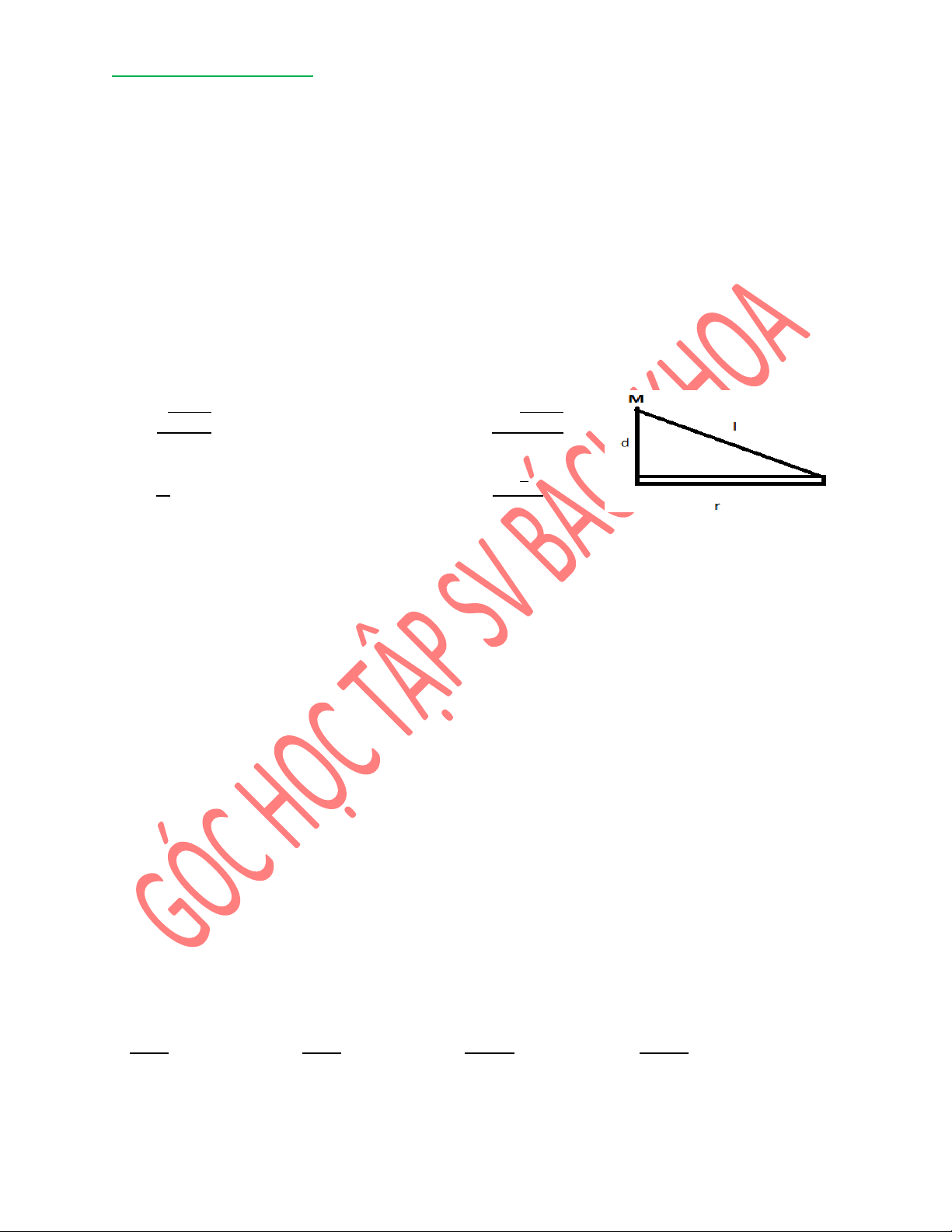 thế do thanh tạo ra ở điểm M cách dây khoảng d trên đường đi qua với một đầu của đoạn dây và vuông góc với thanh. √𝑙2+𝑑2 𝑙+√𝑙2+𝑑2 A.𝑘𝜆 B.𝑘𝜆 𝑑 𝑑 𝑙 𝑙2 1−( )2 C.𝑘𝜆 D.𝑘𝜆 𝑑 𝑑 𝑑