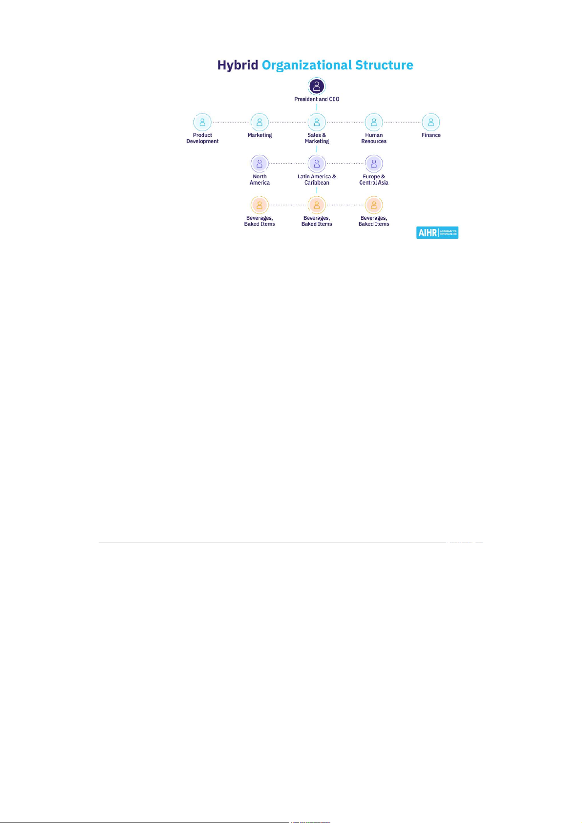 A hybrid design combines multiple organizational forms (functional, divisional, matrix) to