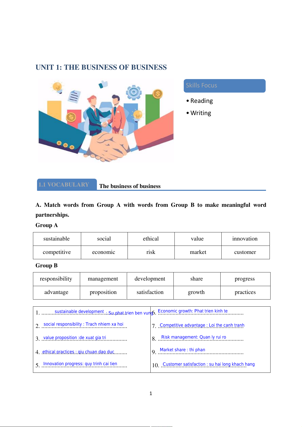 UNIT 1: THE BUSINESS OF BUSINESS Skills Focus • Reading • Writing 1.1 VOCABULARY