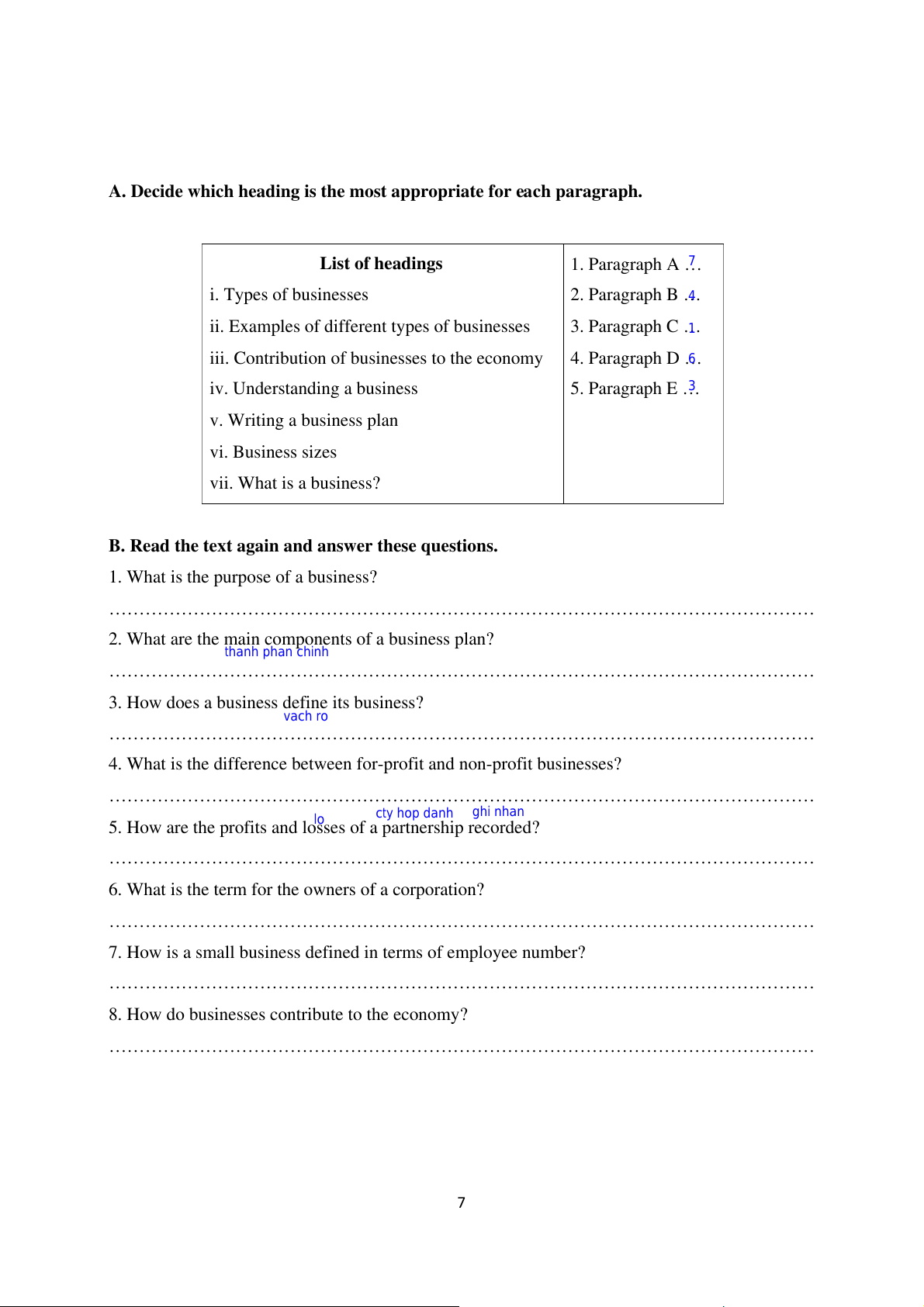 A. Decide which heading is the most appropriate for each paragraph. List of headings 1. Paragraph A … 7 i. Types of businesses 2. Paragraph B … 4