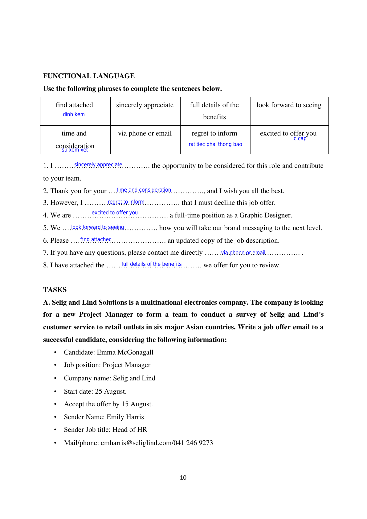 Use the following phrases to complete the sentences below. find attached sincerely appreciate full details of the look forward to seeing dinh kem benefits time and via phone or email regret to inform excited to offer you c.cap consideration rat tiec phai thong bao su xem xet