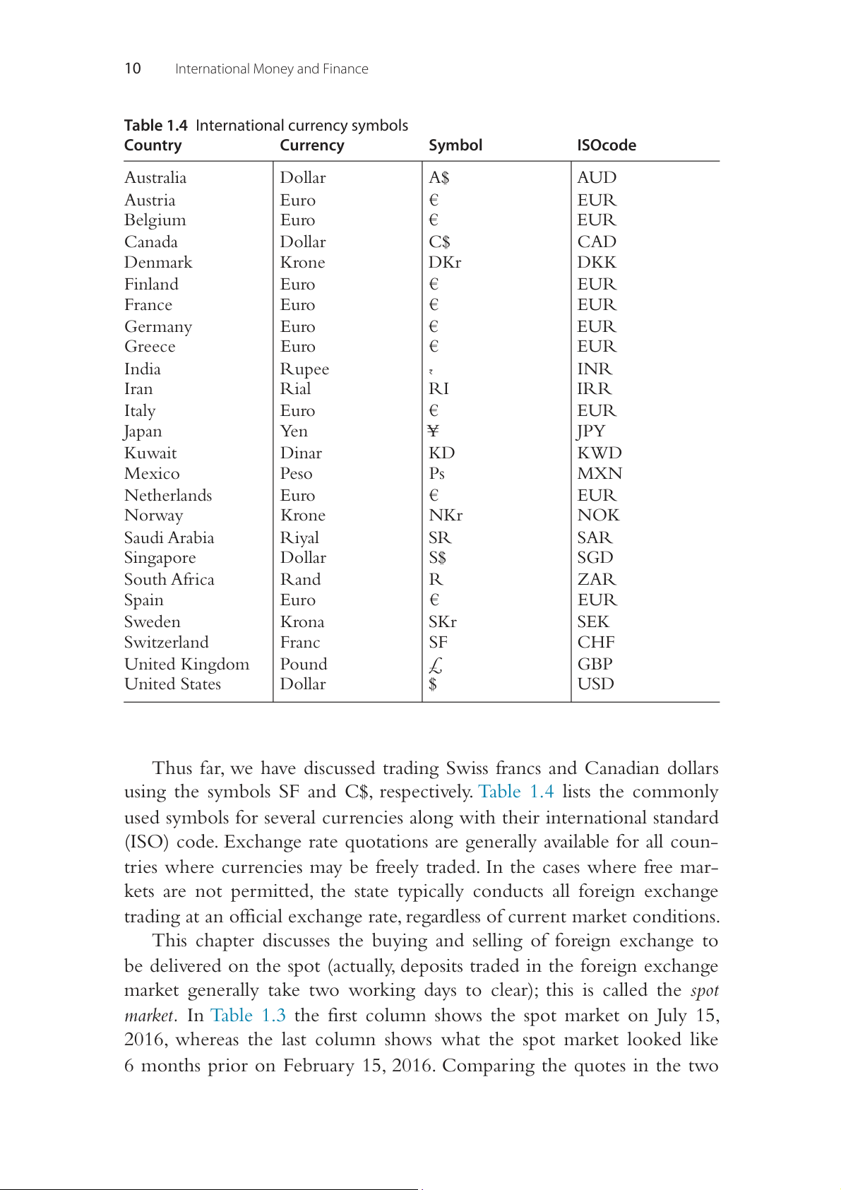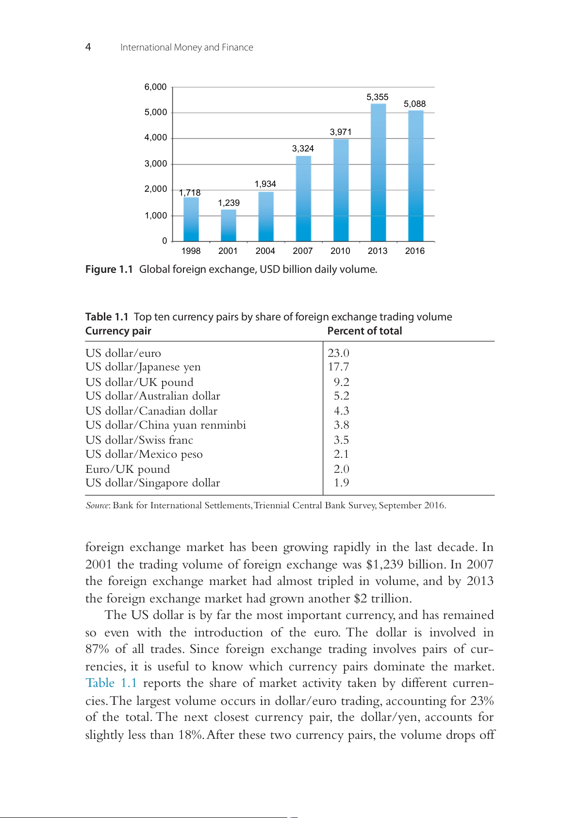 Table 1.1 Top ten currency pairs by share of foreign exchange trading volume Currency pair Percent of total US dollar/euro 23.0 US dollar/Japanese yen 17.7 US dollar/UK pound 9.2 US dollar/Australian dollar 5.2 US dollar/Canadian dollar 4.3 US dollar/China yuan renminbi 3.8 US dollar/Swiss franc 3.5 US dollar/Mexico peso 2.1 Euro/UK pound 2.0 US dollar/Singapore dollar 1.9