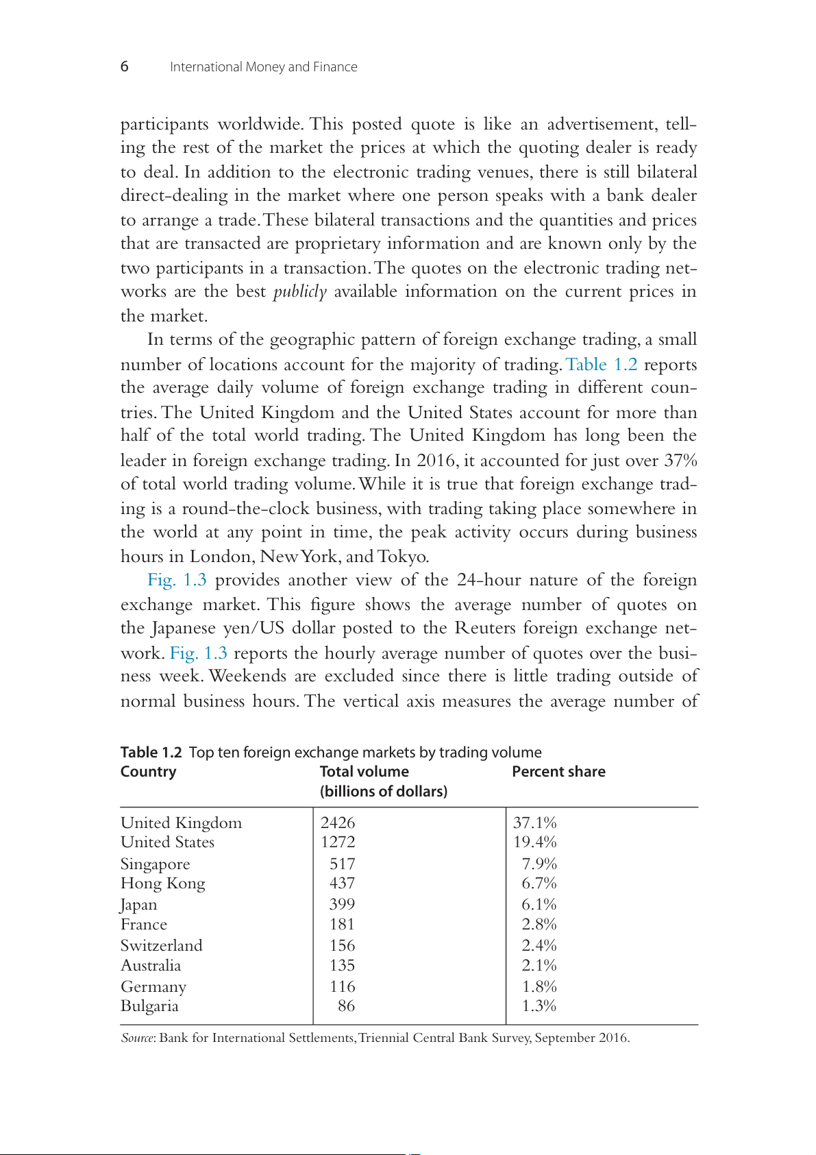 Table 1.2 Top ten foreign exchange markets by trading volume Country Total volume Percent share (billions of dollars) United Kingdom 2426 37.1% United States 1272 19.4% Singapore 517 7.9% Hong Kong 437 6.7% Japan 399 6.1% France 181 2.8% Switzerland 156 2.4% Australia 135 2.1% Germany 116 1.8% Bulgaria 86 1.3%