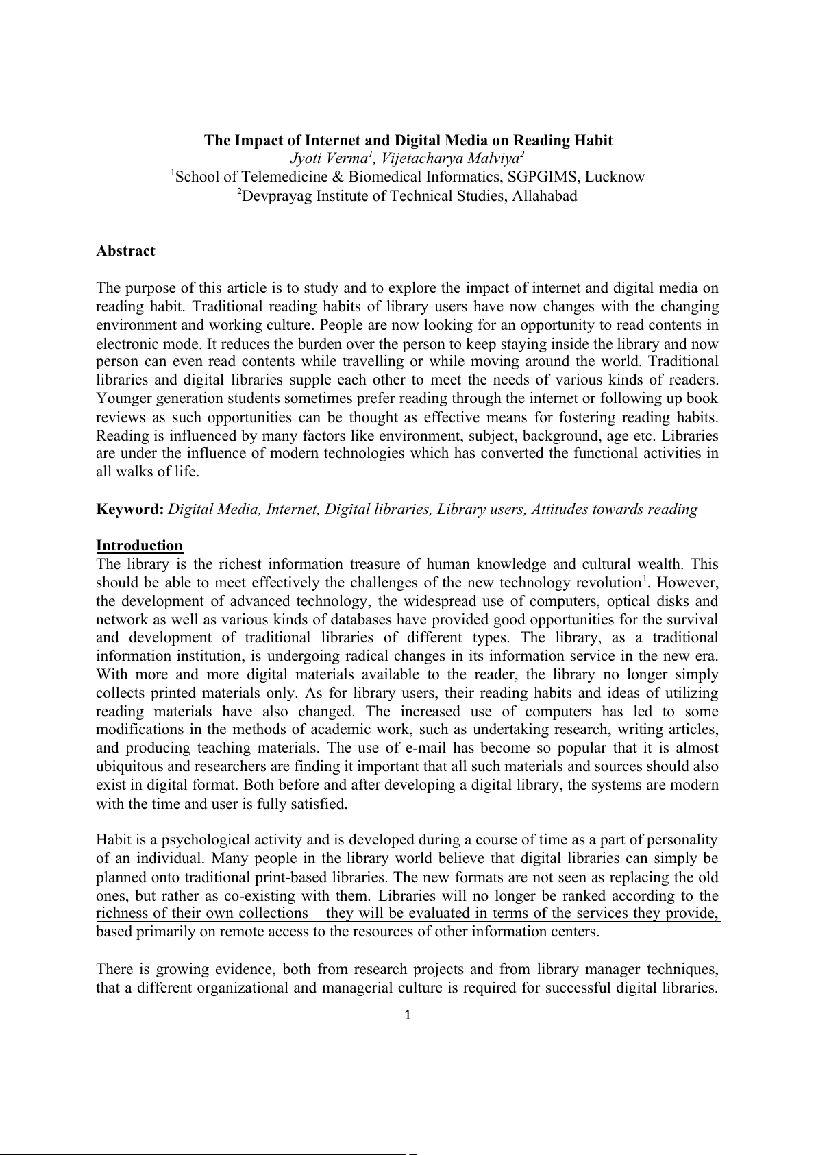 Keyword: Digital Media, Internet, Digital libraries, Library users, Attitudes towards reading Introduction