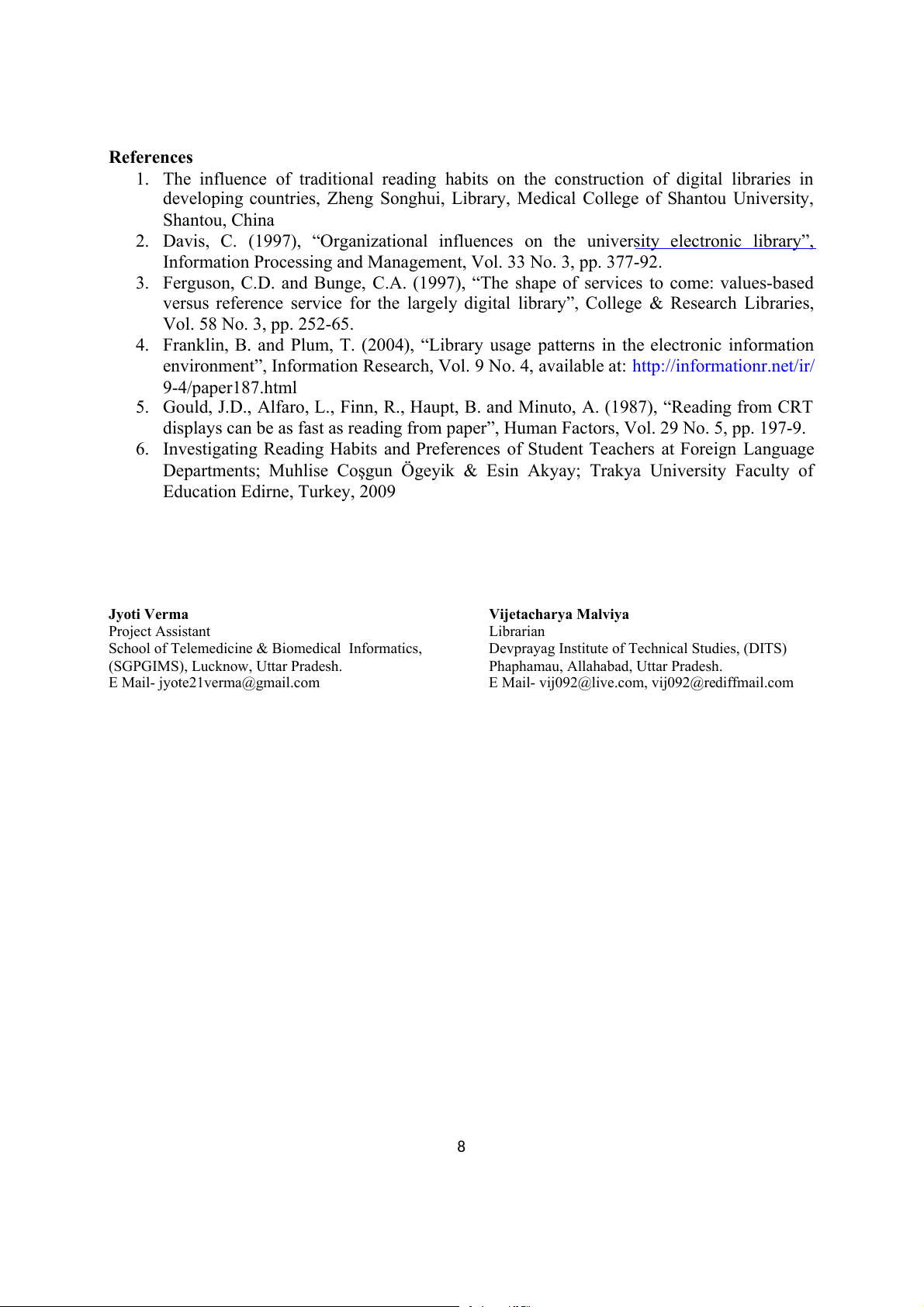 Departments; Muhlise Coşgun Ögeyik & Esin Akyay; Trakya University Faculty of Education Edirne, Turkey, 2009 Jyoti Verma Vijetacharya Malviya Project Assistant Librarian