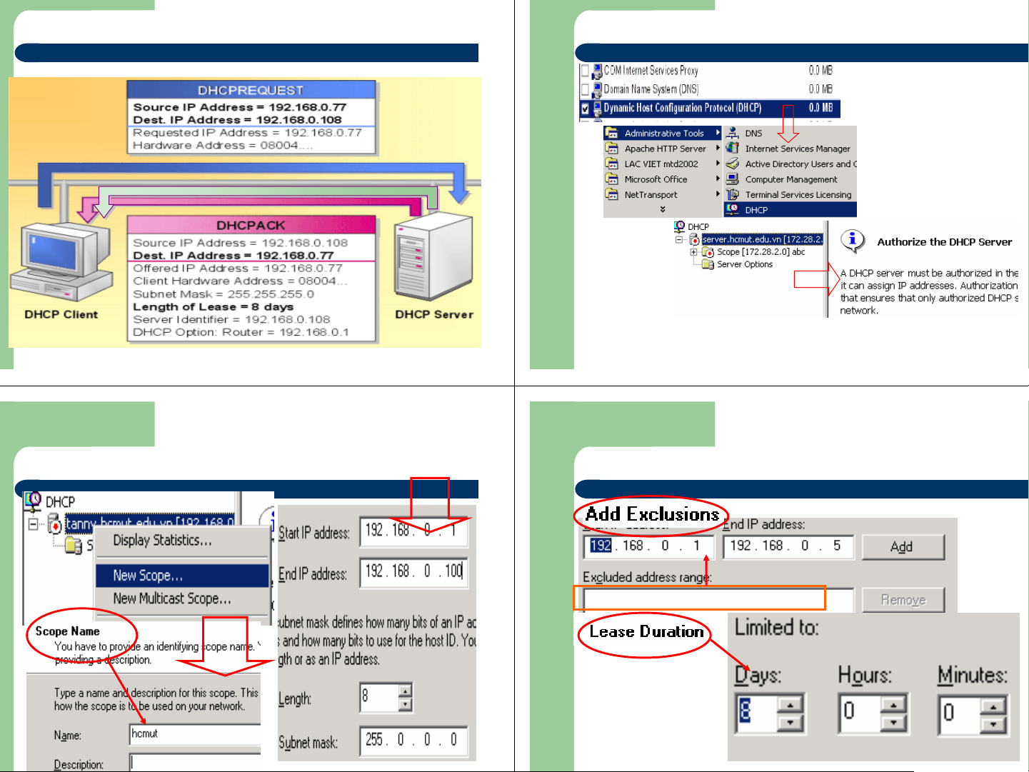 Trung tâm Tin học Bách khoa Aptech Khái niệm DHCP Khái niệm DHCP DHCP Client DHCP Servers 1IP Lease Request IP Lease Offer 2 3IP Lease Selection IP Lease 4 Acknowledgement @Bách Khoa Aptech 2004 Trang 7 @Bách Khoa Aptech 2004 Trang 8