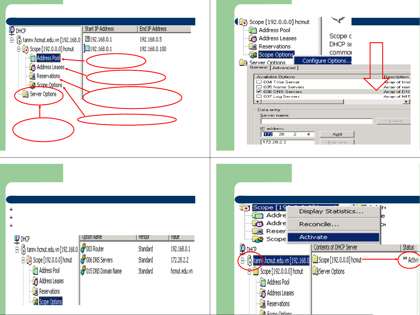 2. Sau khi tạo Scope làm thế nào để hiệu chỉnh địa chỉ mạng Scope Options : a. Xóa và tạo lại Scope Router : 192.168.0.33