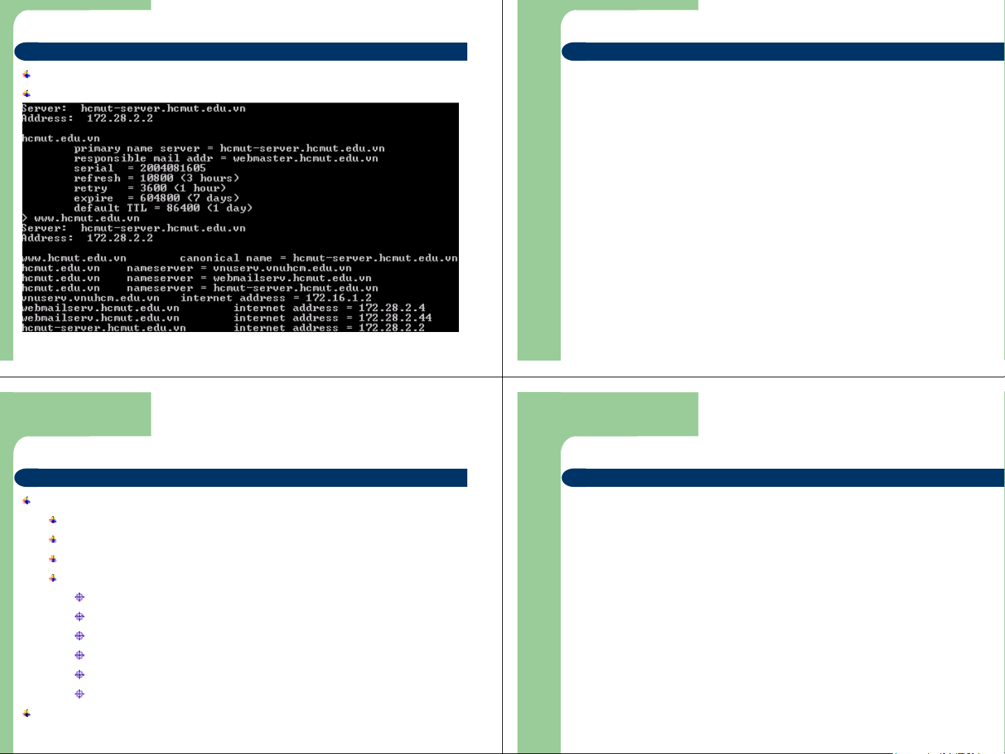 IP address for hcmut.edu.vn? IP addres IP addres s = s = 172.28.1.2 172.28.1.2 DNS Server Reverse Lookup Name for Name for 172.28.1.2? 172.28.1.2? Name = Name = h h cmut.edu.vn cmut.edu.vn DNS Server @Bách Khoa Aptech 2004 Trang 29 @Bách Khoa Aptech 2004 Trang 30