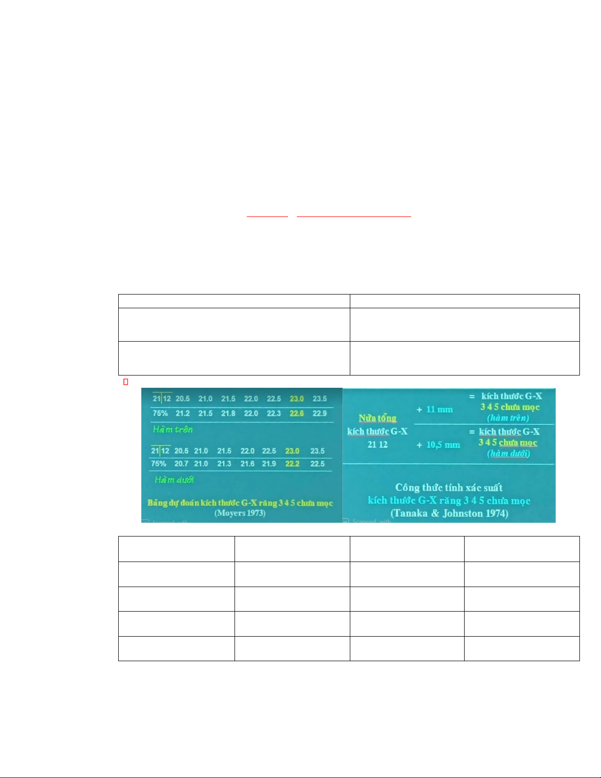 KT răng chưa mọc: phim X quang, bảng dự đoán( Moyers), Ct xác xuất: Trái R R cửa HD Phải R 3 4 5 3 4 5 Khoảng trống hiện có Kích thước răng 22,2( Bảng) 23 22,2( Bảng) Chênh lệch Chênh lệch tổng cộng -