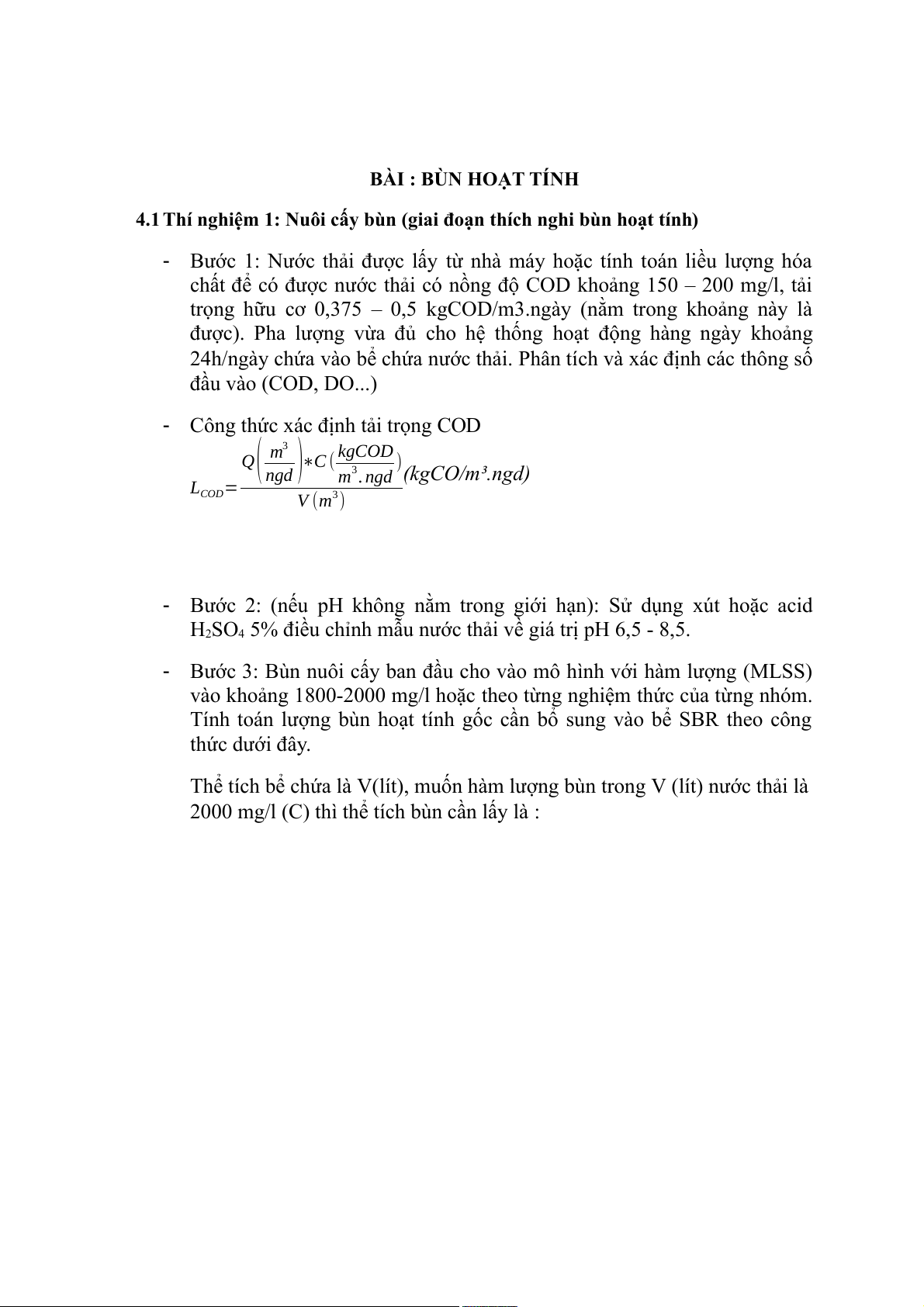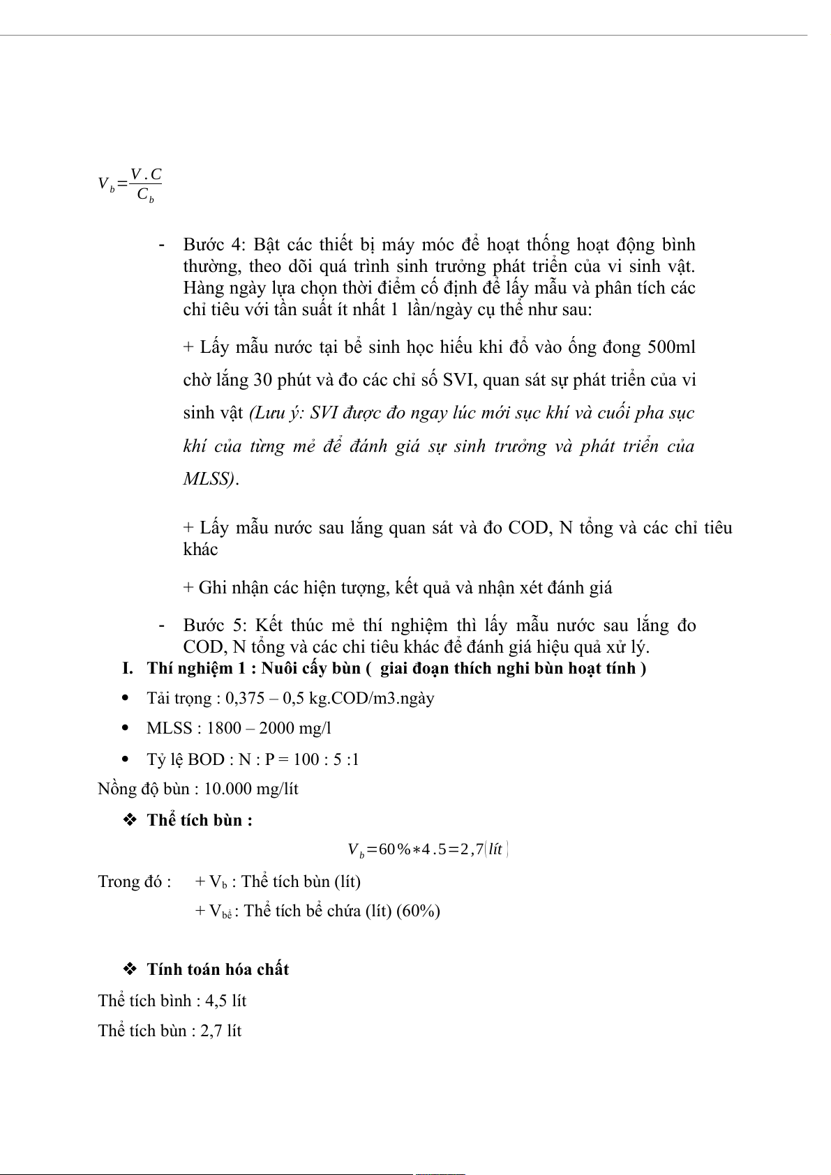 I. Thí nghiệm 1 : Nuôi cấy bùn ( giai đoạn thích nghi bùn hoạt tính )