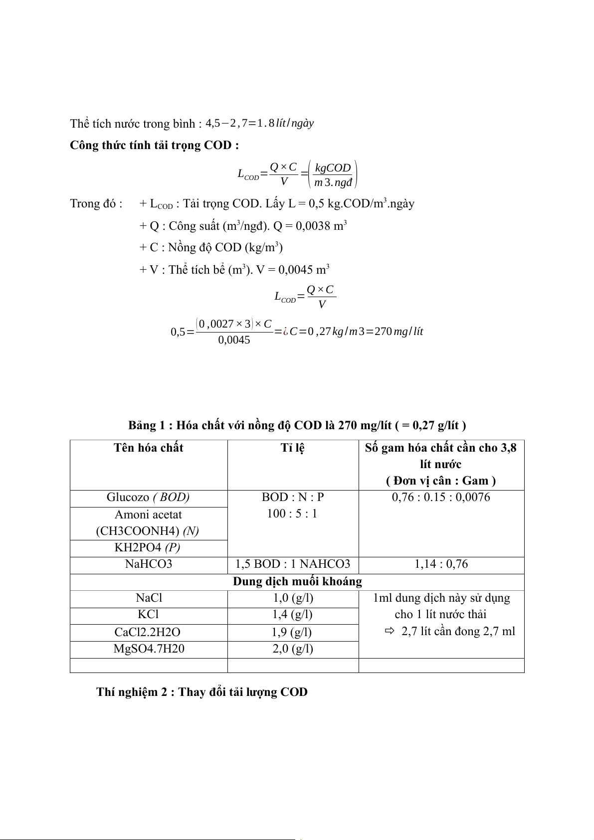 Bảng 1 : Hóa chất với nồng độ COD là 270 mg/lít ( = 0,27 g/lít ) Tên hóa chất Tỉ lệ