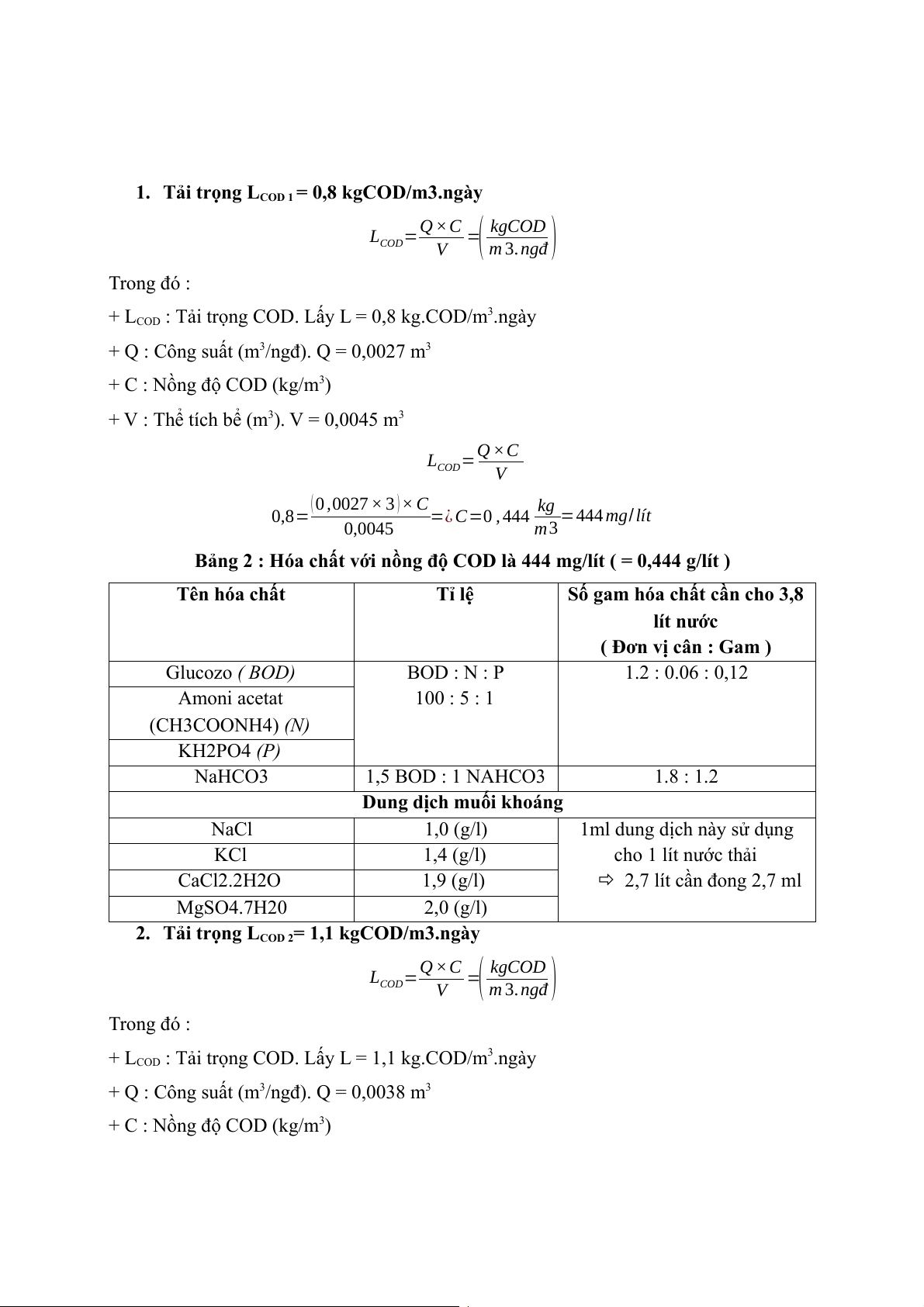 COD : Tải trọng COD. Lấy L = 0,8 kg.COD/m .ngày