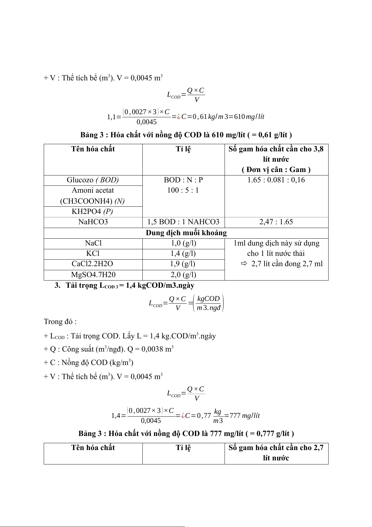 3. Tải trọng LCOD 3 = 1,4 kgCOD/m3.ngày L
