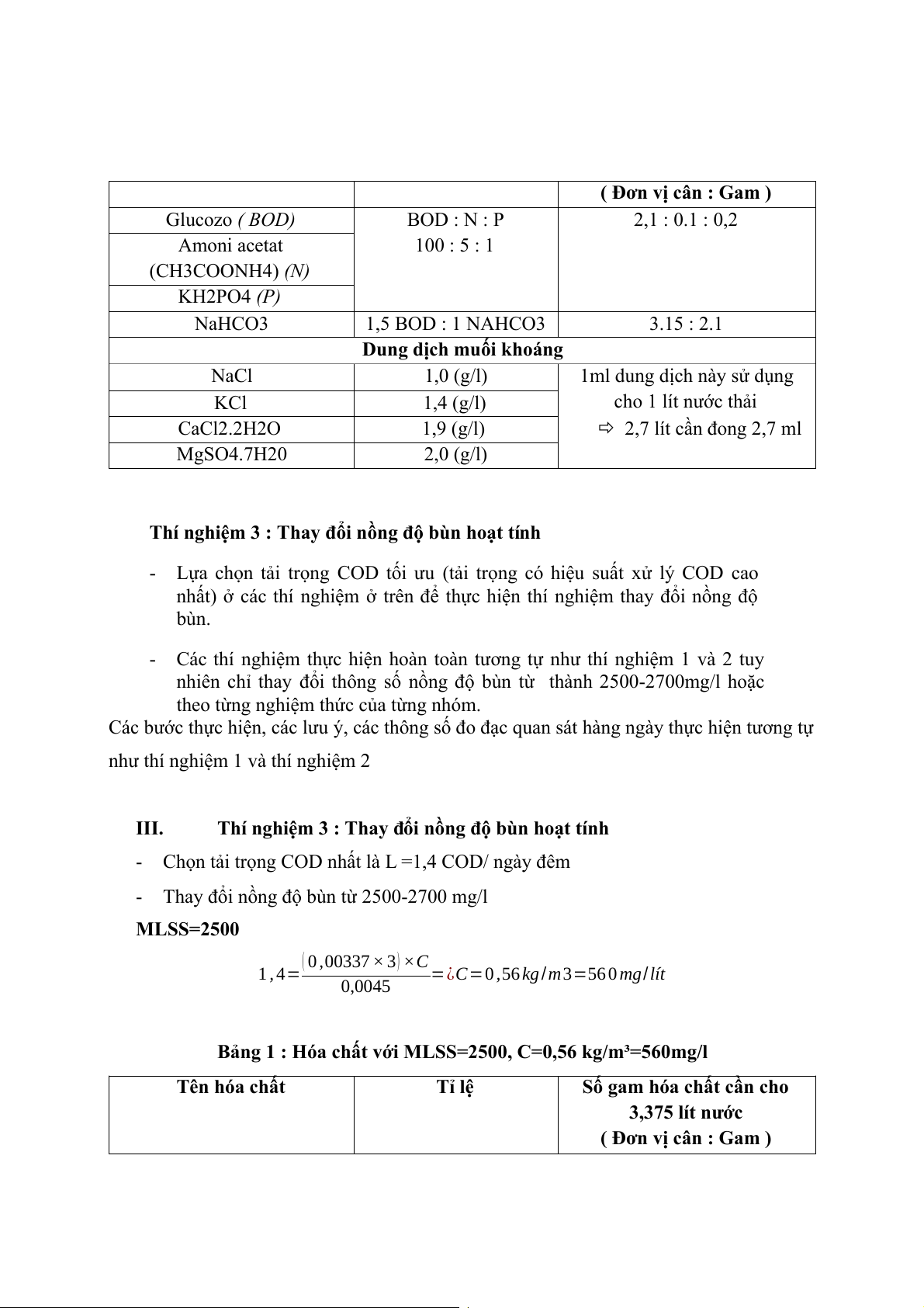 1ml dung dịch này sử dụng KCl 1,4 (g/l) cho 1 lít nước thải CaCl2.2H2O 1,9 (g/l) MgSO4.7H20 2,0 (g/l) MLSS=2600