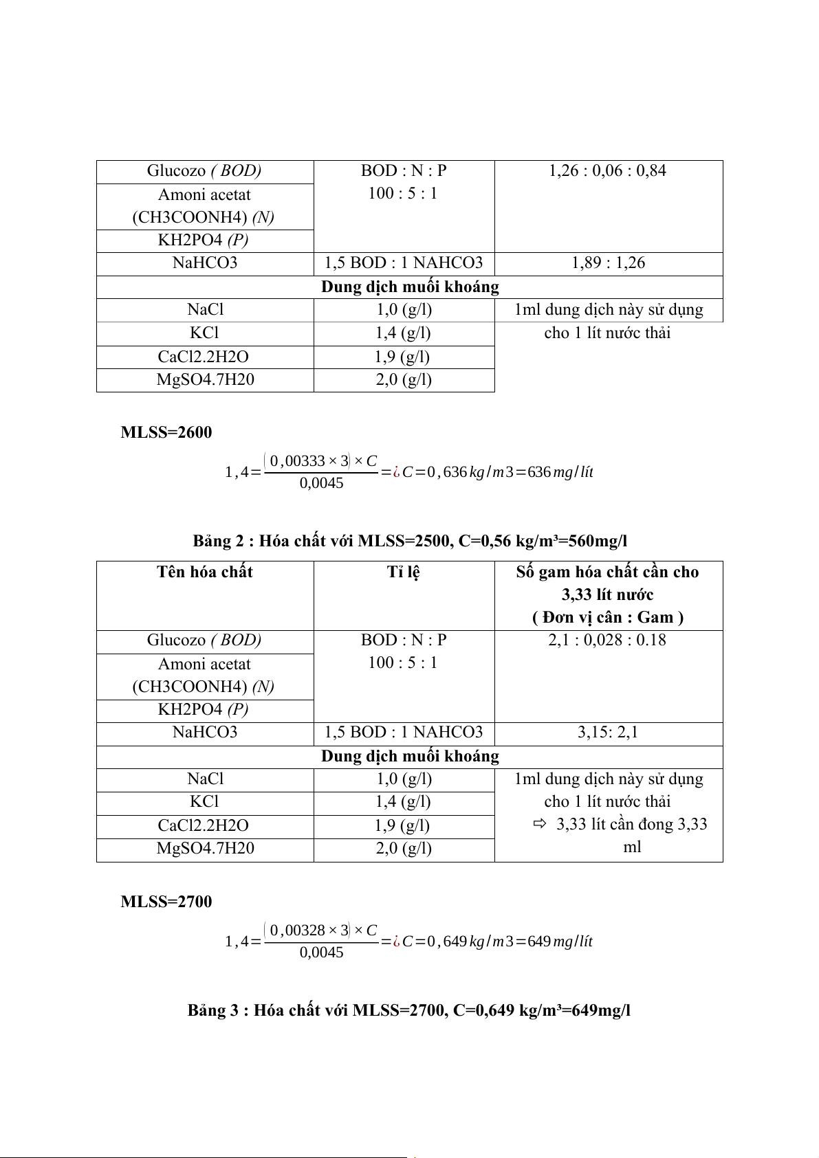 Bảng 2 : Hóa chất với MLSS=2500, C=0,56 kg/m³=560mg/l Tên hóa chất Tỉ lệ