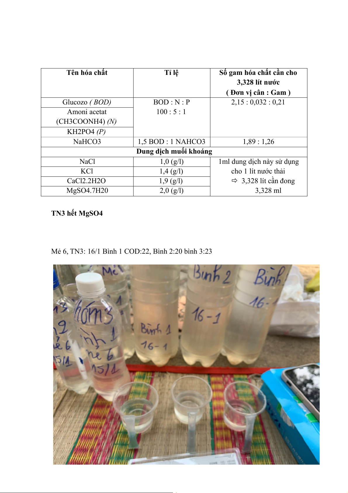 1ml dung dịch này sử dụng KCl 1,4 (g/l) cho 1 lít nước thải CaCl2.2H2O 1,9 (g/l) 3,328 lít cần đong MgSO4.7H20 2,0 (g/l) 3,328 ml TN3 hết MgSO4