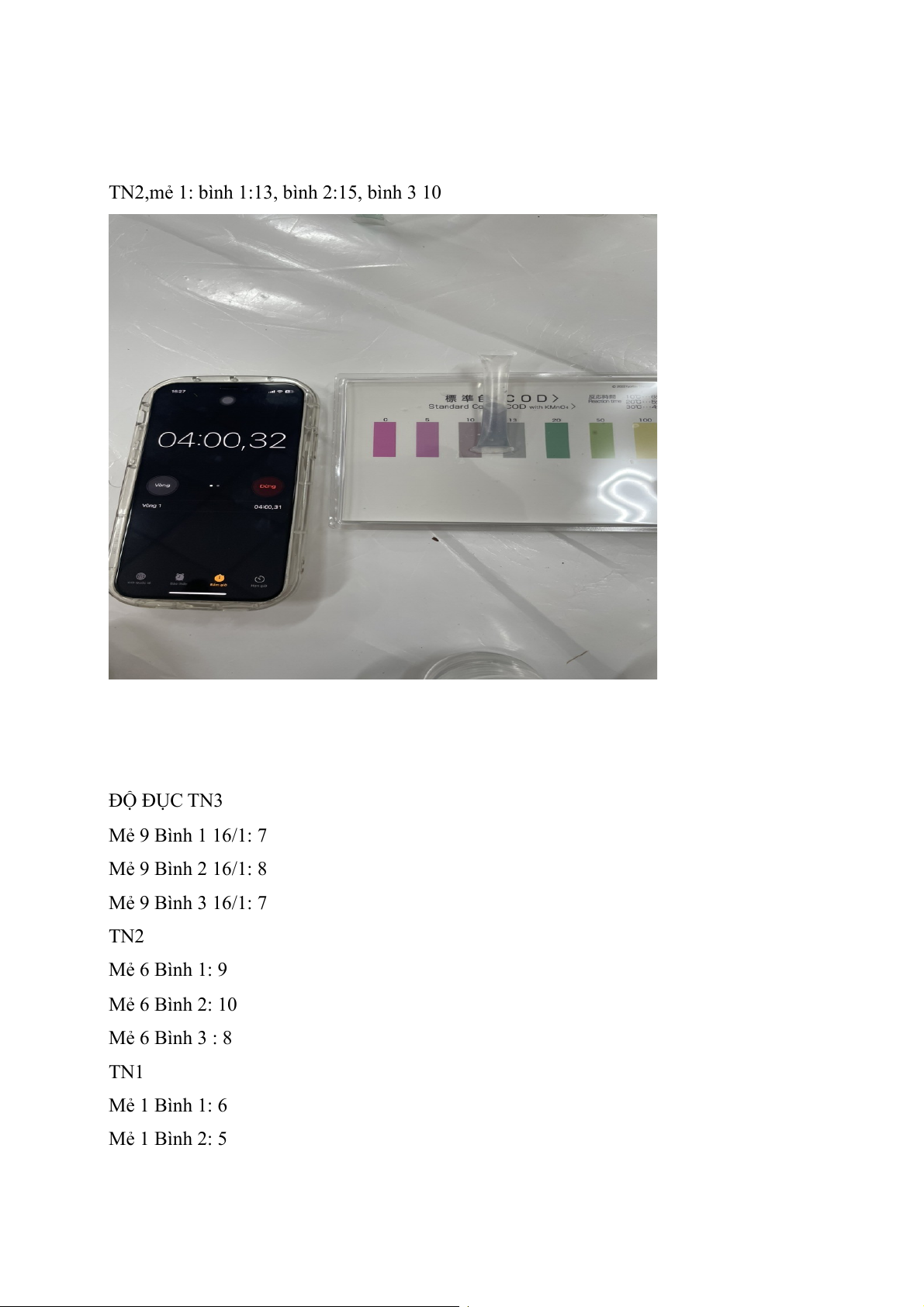 TN2,mẻ 1: bình 1:13, bình 2:15, bình 3 10 ĐỘ ĐỤC TN3 Mẻ 9 Bình 1 16/1: 7 Mẻ 9 Bình 2 16/1: 8 Mẻ 9 Bình 3 16/1: 7 TN2 Mẻ 6 Bình 1: 9 Mẻ 6 Bình 2: 10 Mẻ 6 Bình 3 : 8 TN1 Mẻ 1 Bình 1: 6 Mẻ 1 Bình 2: 5 Mẻ 1 Bình 3: 6