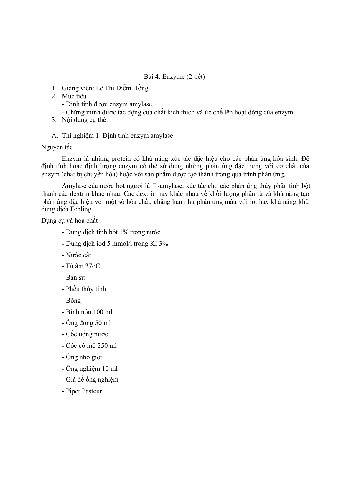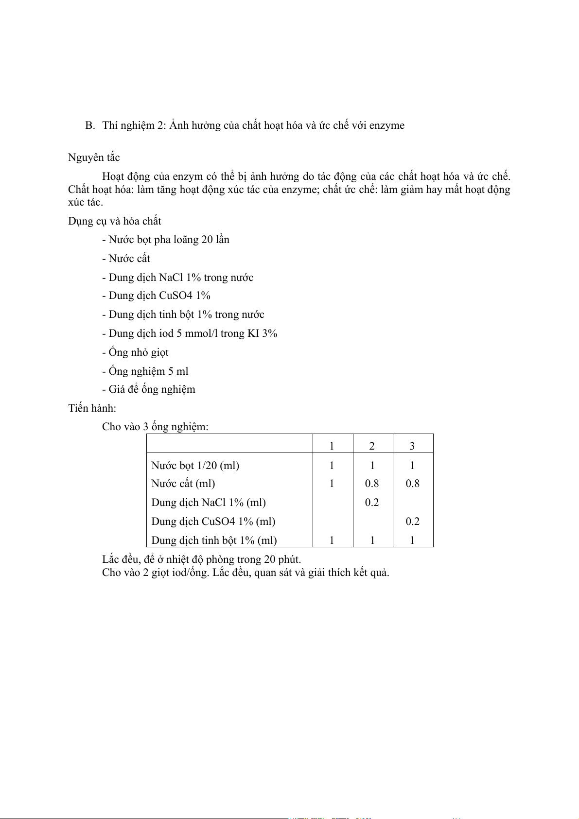 - Dung dịch iod 5 mmol/l trong KI 3% - Ống nhỏ giọt - Ống nghiệm 5 ml - Giá để ống nghiệm Tiến hành: Cho vào 3 ống nghiệm: 1 2 3 Nước bọt 1/20 (ml) 1 1 1 Nước cất (ml) 1 0.8 0.8 Dung dịch NaCl 1% (ml) 0.2 Dung dịch CuSO4 1% (ml) 0.2 Dung dịch tinh bột 1% (ml) 1 1 1