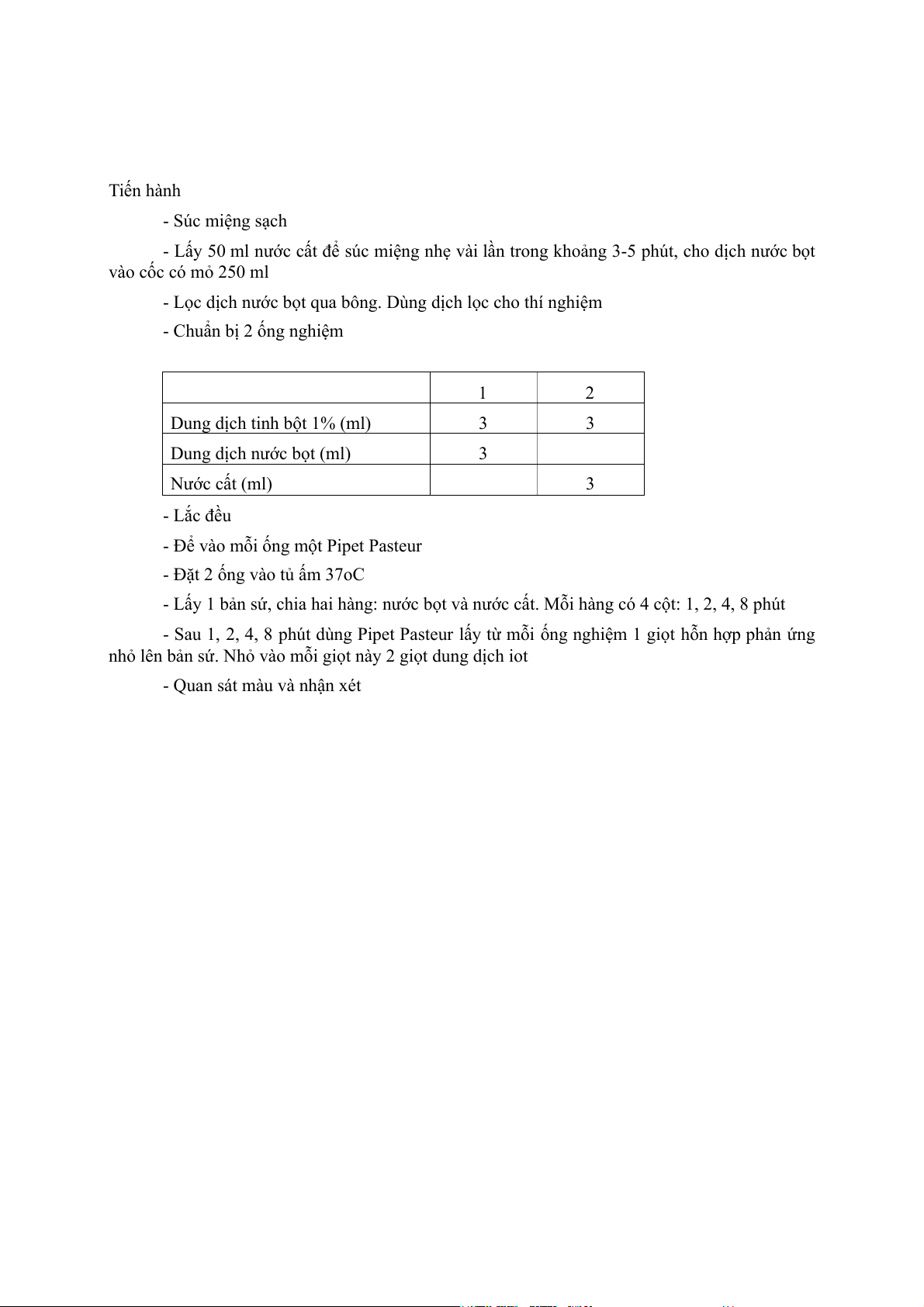 - Chuẩn bị 2 ống nghiệm 1 2 Dung dịch tinh bột 1% (ml) 3 3 Dung dịch nước bọt (ml) 3 Nước cất (ml) 3 - Lắc đều