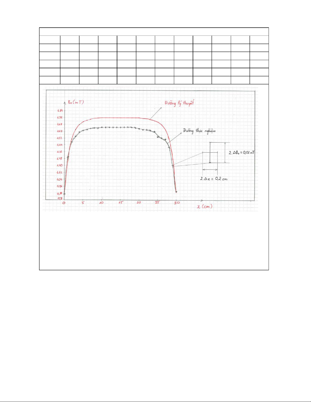 KHẢO SÁT VÀ ĐO CẢM ỨNG TỪ DỌC THEO CHIỀU DÀI MỘT ỐNG DÂY THẲNG DÀI BẢNG SỐ LIỆU Thang đo I 10 (A) sai số dụng cụ 0.01 (A) n = 2500 vòng/m 19.99 (mT) sai số dụng cụ 0.01 (mT) R = 2.02 cm Th C a ư n ờ g n gđ o đ ộB o dòng điện I: 0.4 (A) L = 30 cm x (cm) 0 1 2 3 4 5 6 7 8 9 10 Bo(mT) 0.87 1.30 1.47 1.54 1.59 1.61 1.62 1.63 1.64 1.64 1.65 x (cm) 11 12 13 14 15 16 17 18 19 20 21 Bo(mT) 1.65 1.65 1.65 1.65 1.65 1.65 1.65 1.65 1.64 1.63 1.62 x (cm) 22 23 24 25 26 27 28 29 30 Bo(mT) 1.62 1.61 1.60 1.54 1.53 1.51 1.42 1.21 0.90