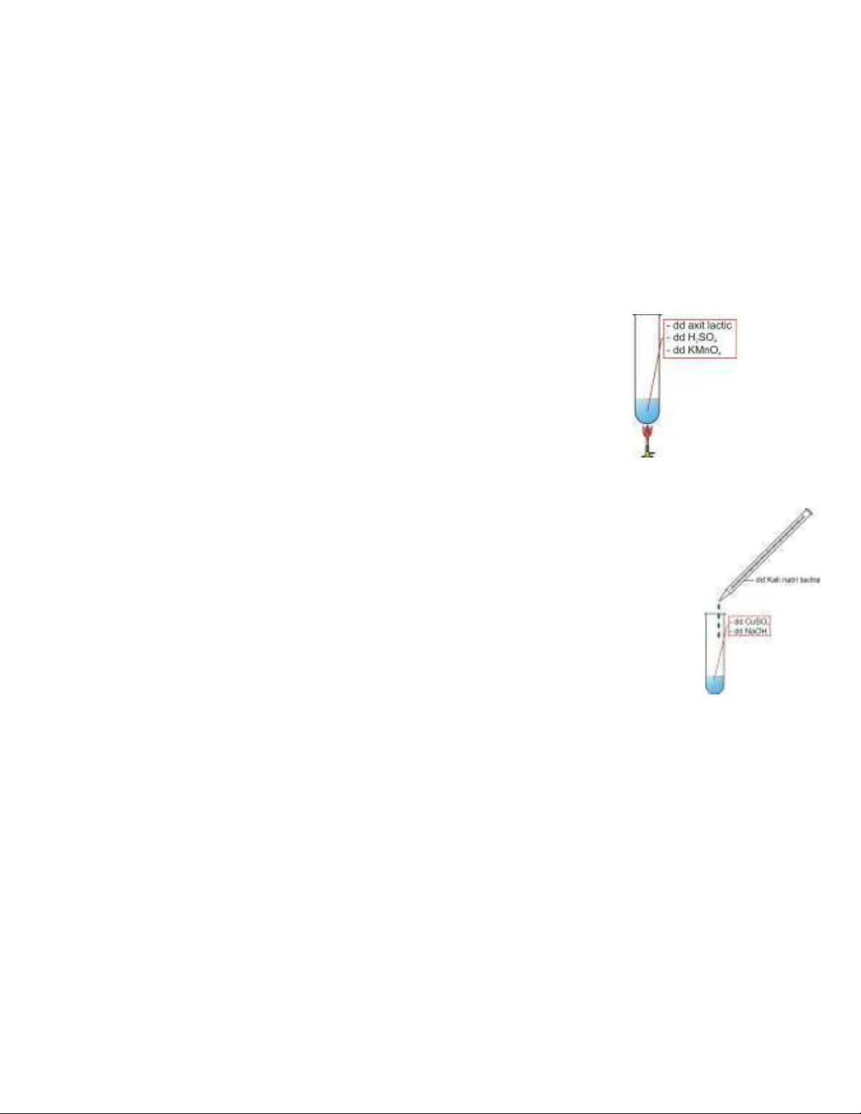 Cho 0,5ml axit lactic, 0,5ml dung dịch H2SO4 và 1ml dung dịch KMnO4 5% vào ống nghiệm.