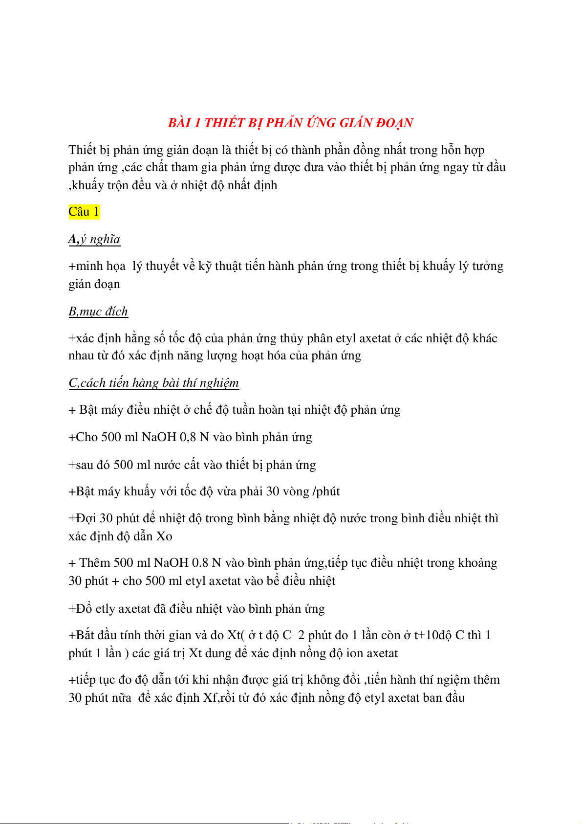 +minh họa lý thuyết về kỹ thuật tiến hành phản ứng trong thiết bị khuấy lý tưởng gián đoạn B,mục đích