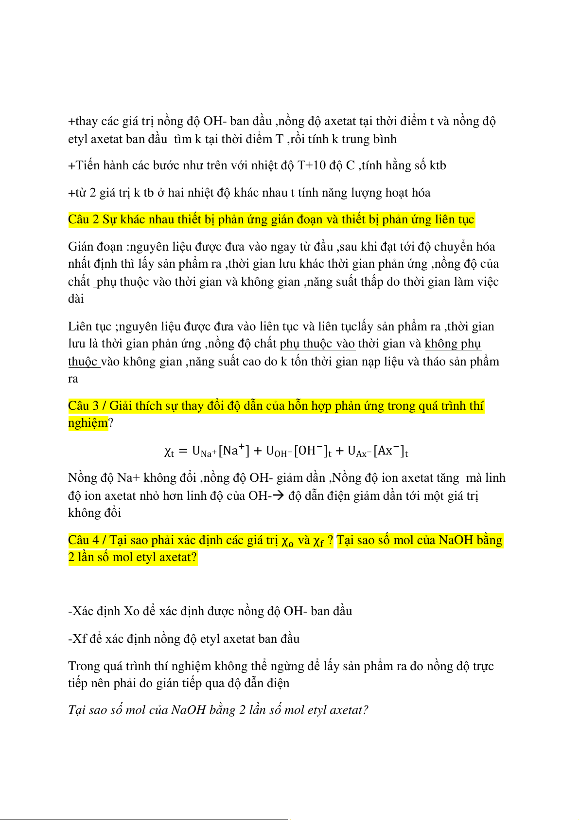 Câu 4 / Tại sao phải xác định các giá trị χ và χf ? Tại sao số mol c o ủa NaOH bằng 2 lần số mol etyl axetat?