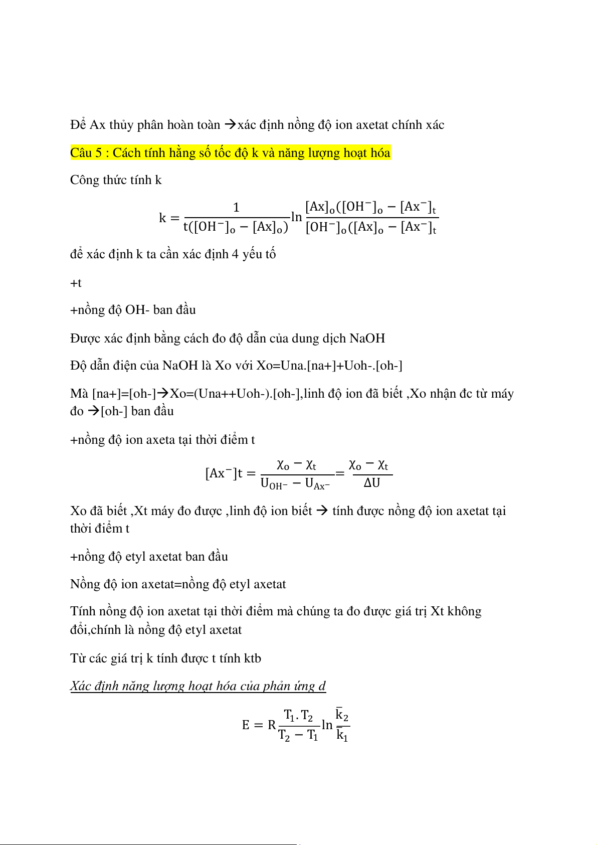 Câu 5 : Cách tính hằng số tốc độ k và năng lượng hoạt hóa Công thức tính k 1 [A ] x ([OH−] ] o o − [Ax− t k = ln t([OH−] − o − [A ] x o) [OH ] ([ ] ] o Ax o − [Ax− t