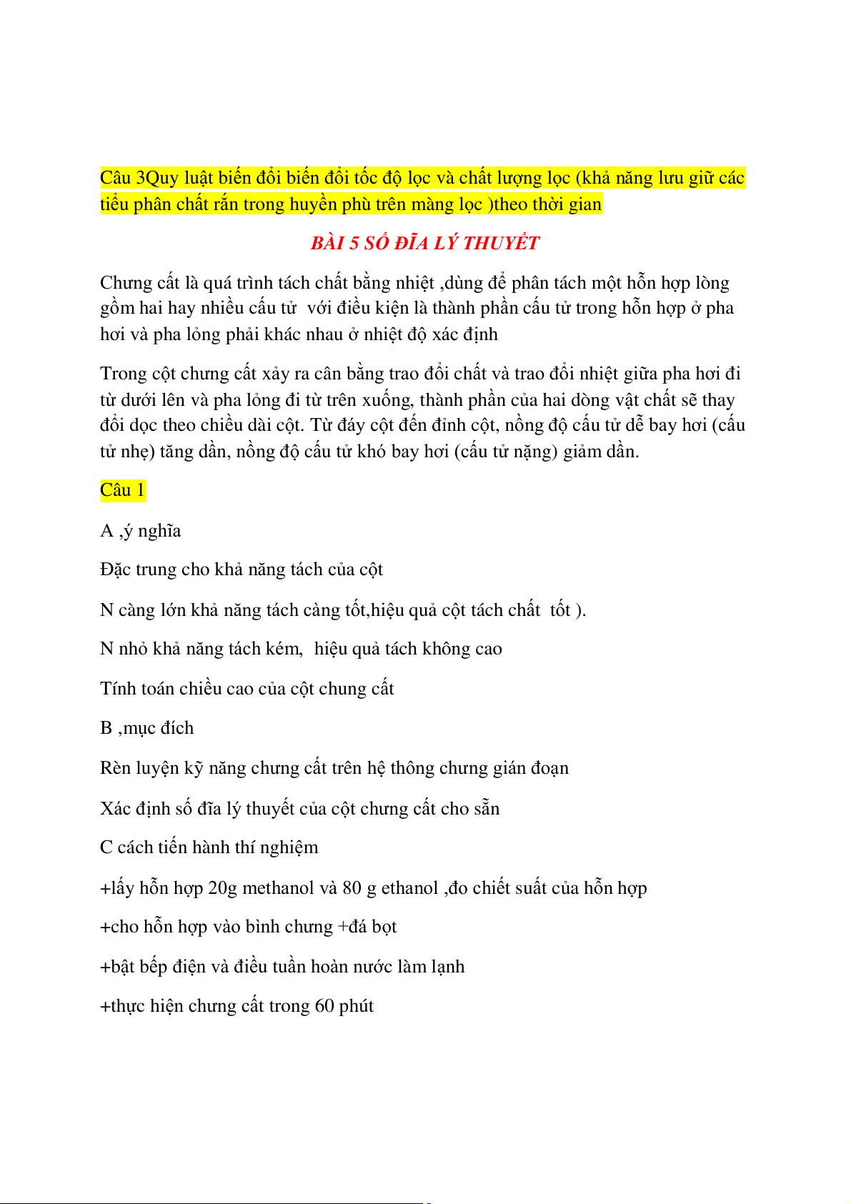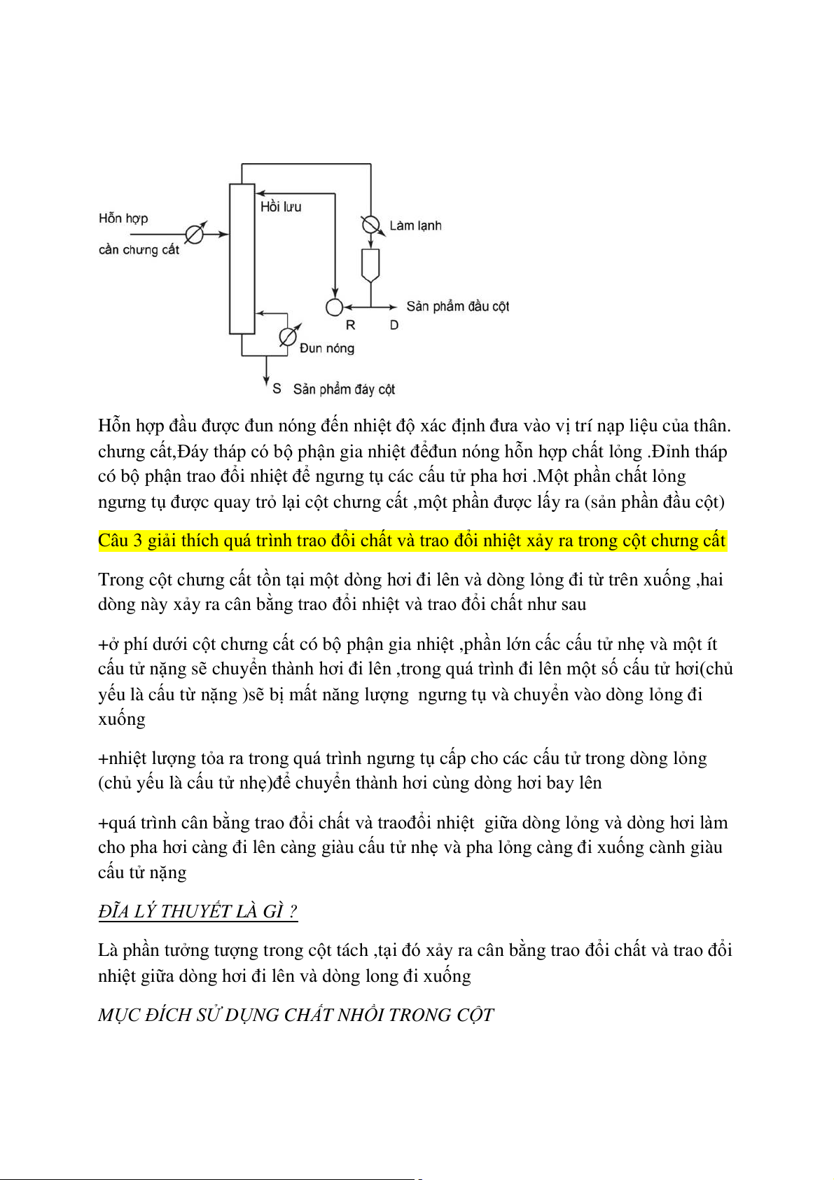 Câu 3 giải thích quá trình trao đổi chất và trao đổi nhiệt xảy ra trong cột chưng cất