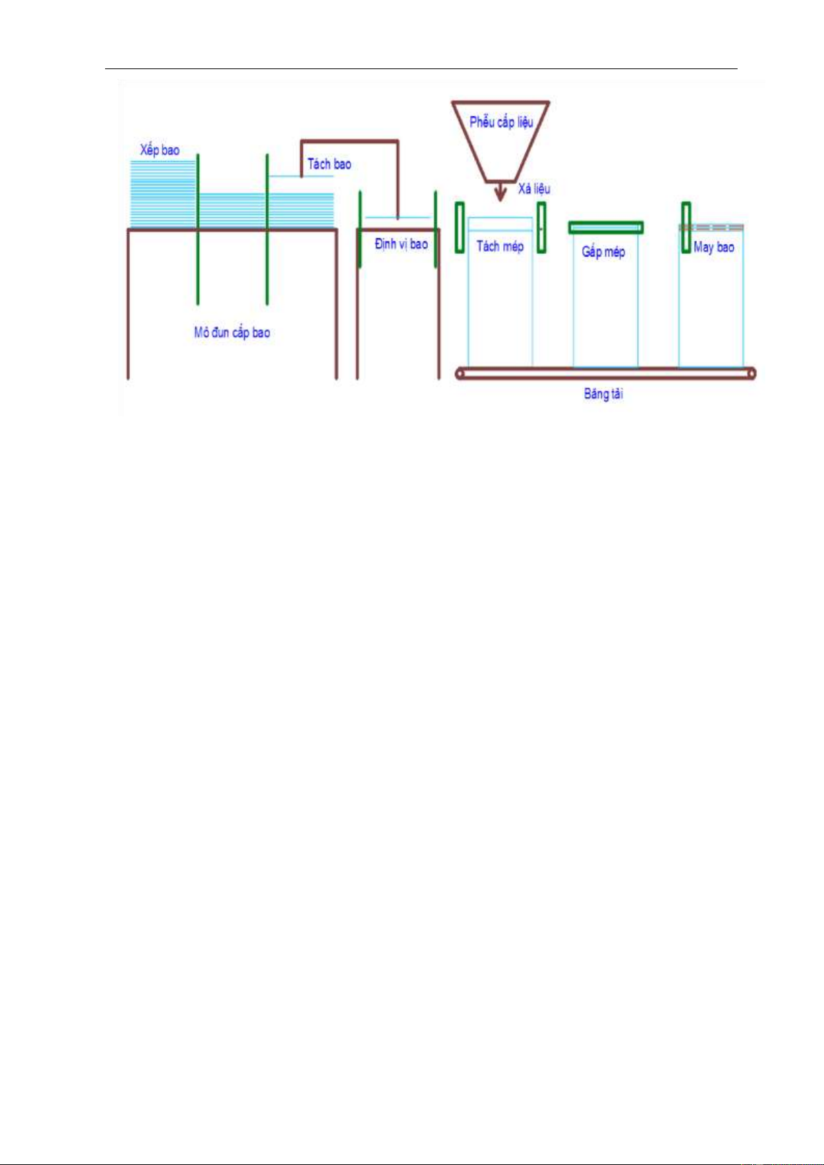 bao, định vị và mở miệng bao, đưa bao vào phễu và xả nguyên liệu, di chuyển bao đến