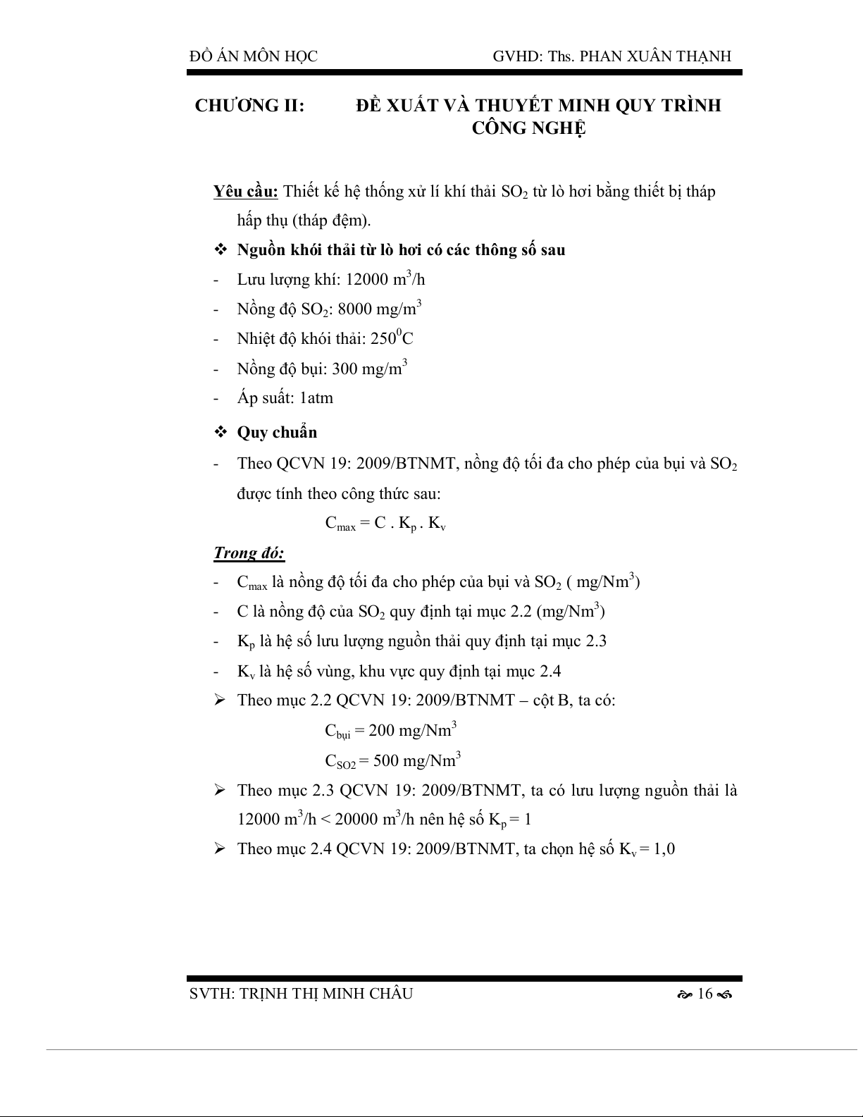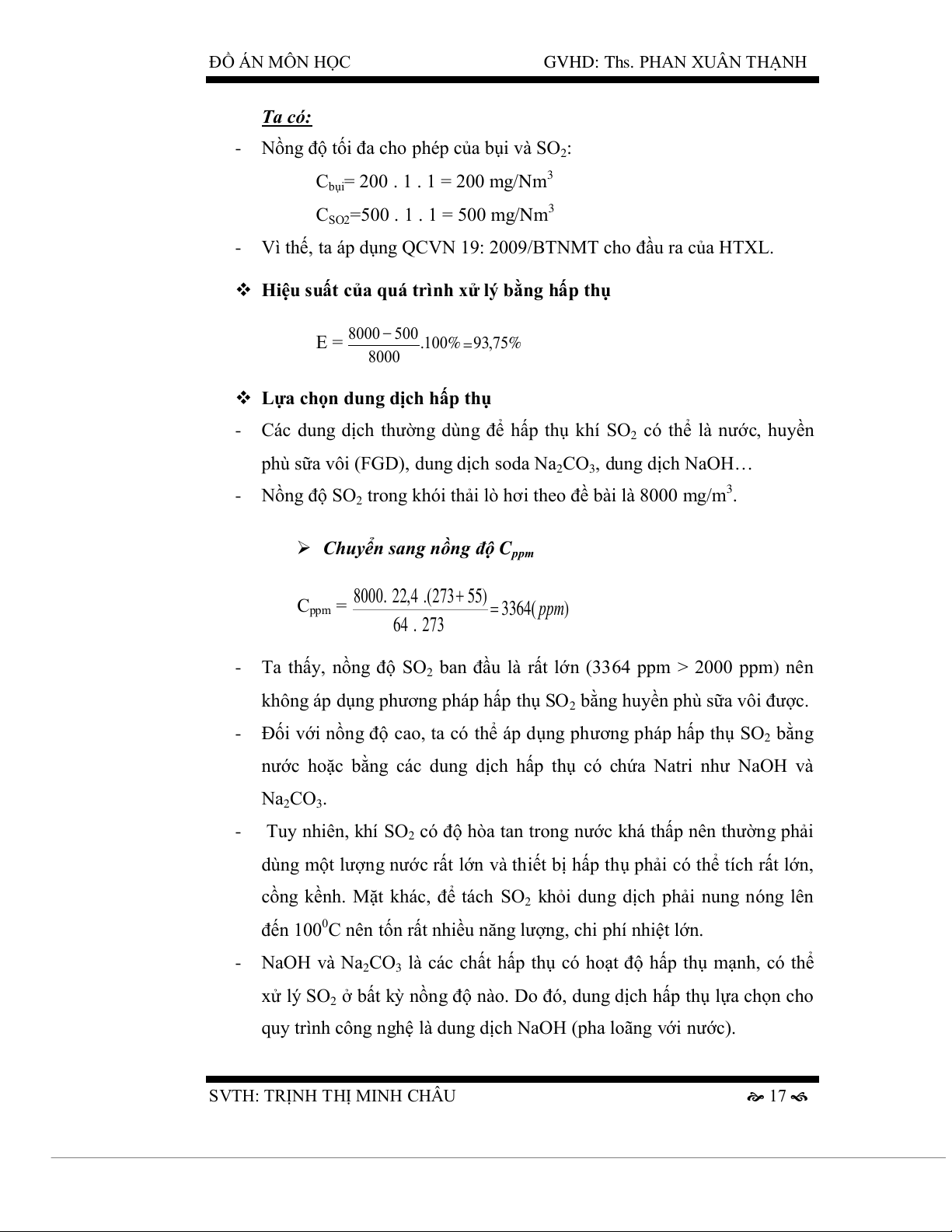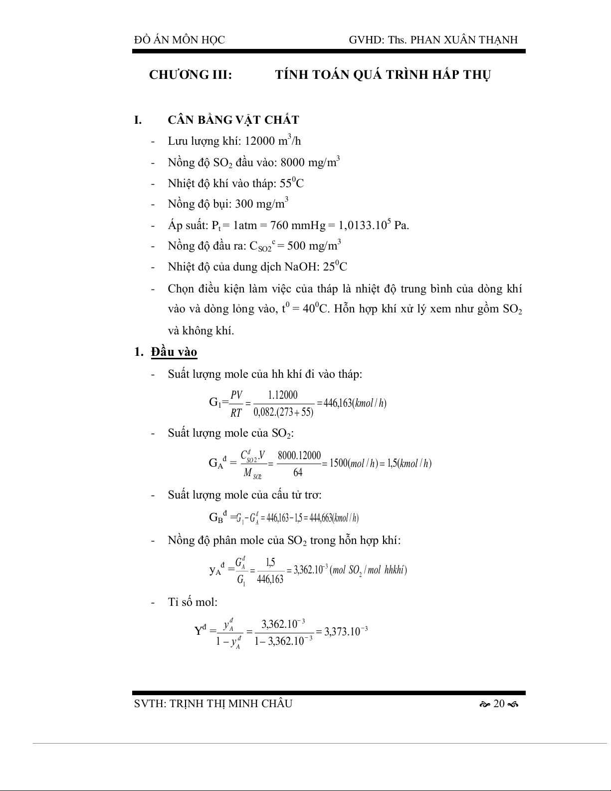 - Áp suất: Pt = 1atm = 760 mmHg = 1,0133.105 Pa. - Nồng độ đầu ra: C c SO2 = 500 mg/m3
