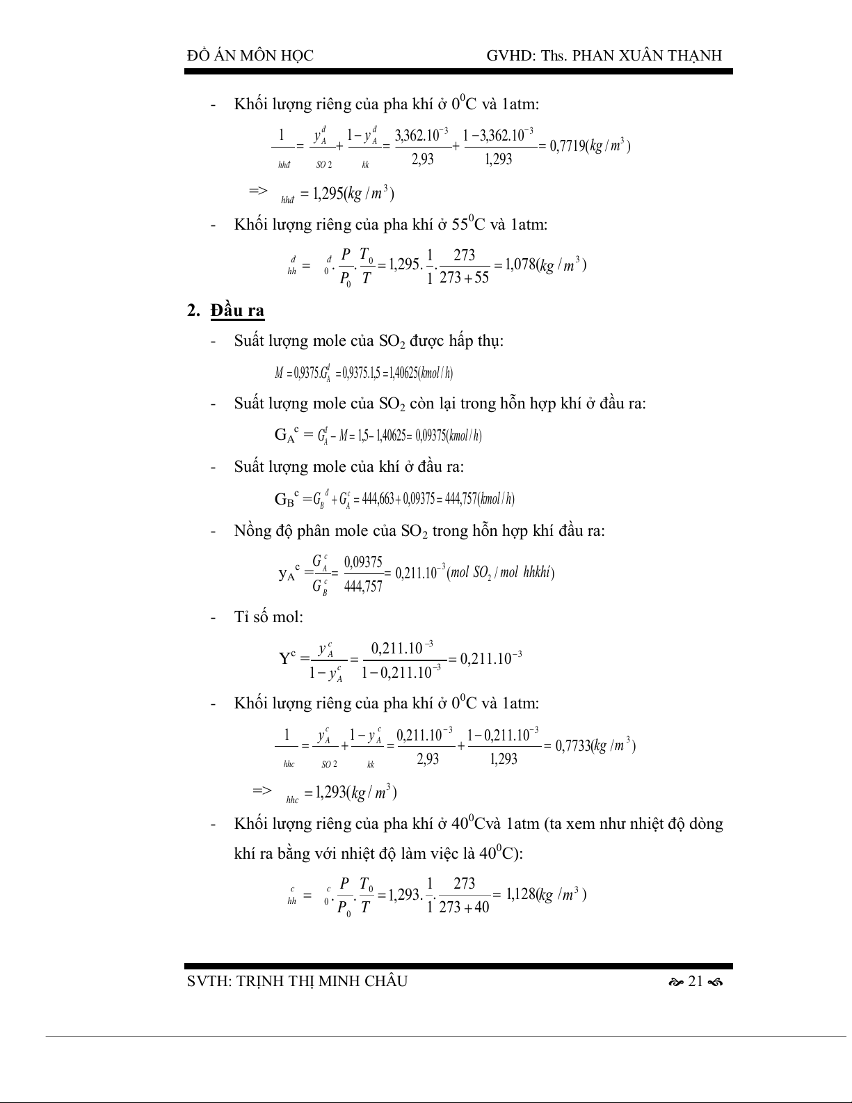 - Khối lượng riêng của pha khí ở 00C và 1atm: c c − 3 −3 1 y 1 − y − A A , 0 21 .110 1 , 0 21 .110 = + = + = ,0773 ( 3 kg / 3 m ) ρhhc ρ ρ SO 2 kk 9, 2 3 ,1293 => ρ = ,129 (3kg / 3 m ) hhc