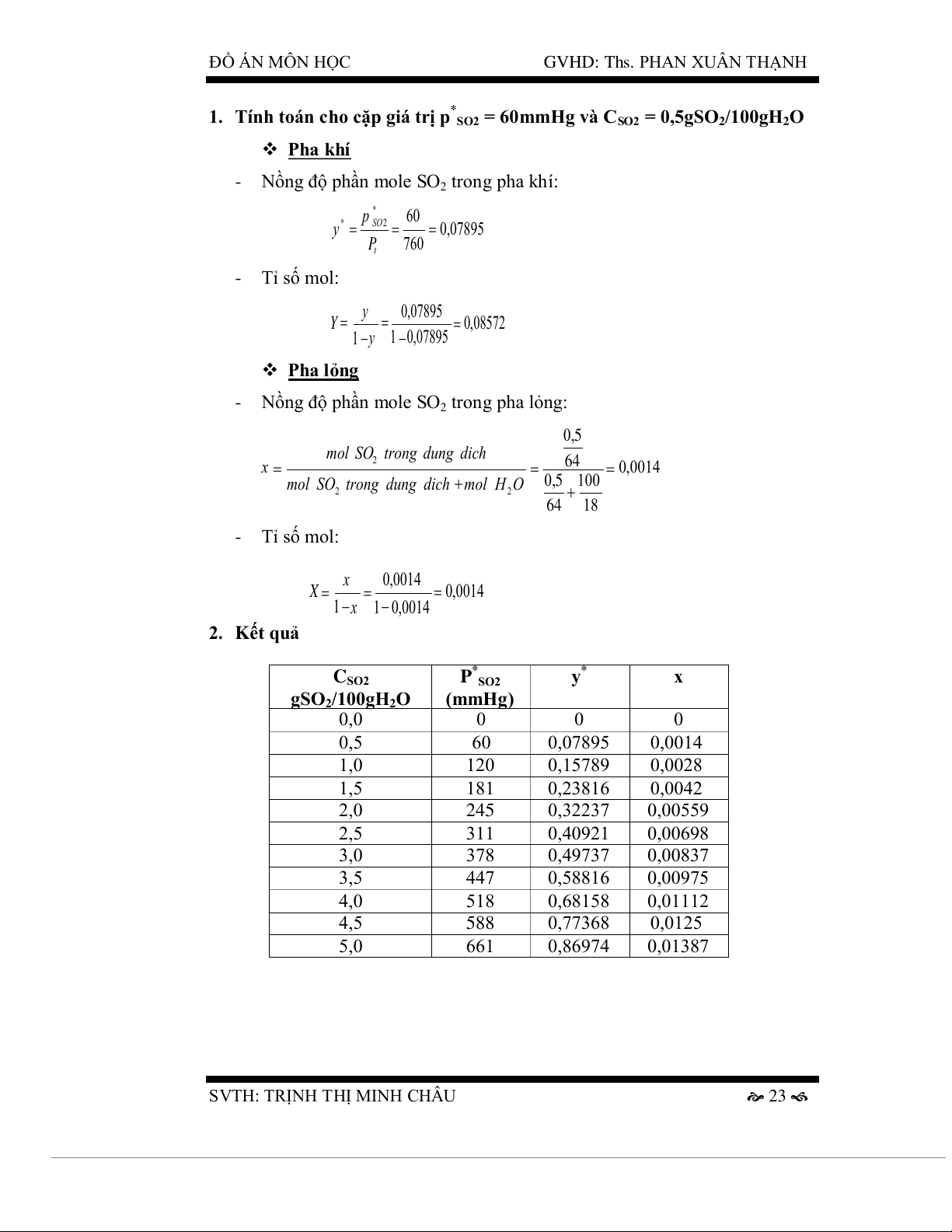 - Nồng độ phần mole SO2 trong pha khí: * p 60 * SO2 y = = = 07895 ,0 P 760 t - Tỉ số mol: y ,007895 Y = = = ,008572 1 −y 1 − ,007895 Pha lỏng