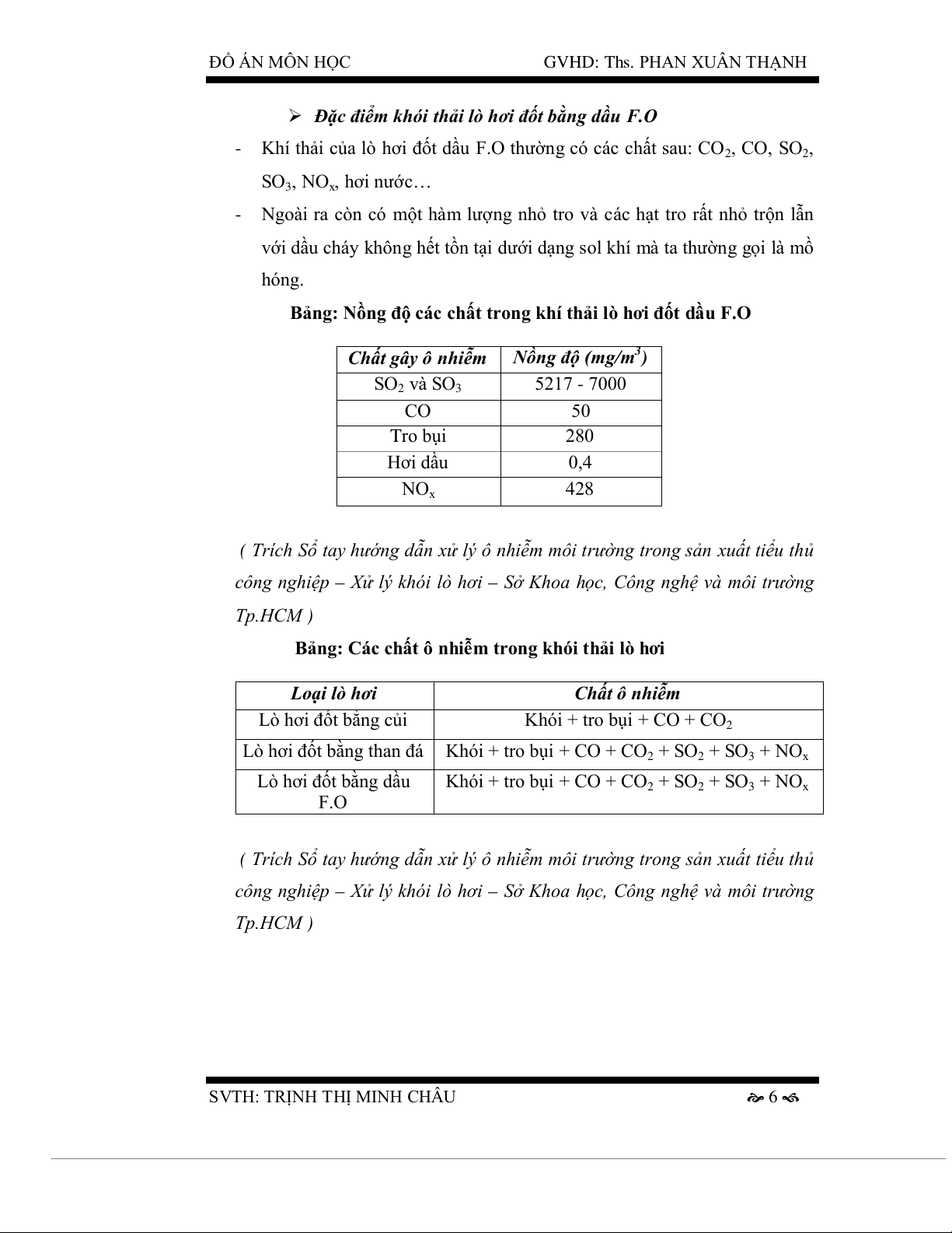Bảng: Nồng độ các chất trong khí thải lò hơi đốt dầu F.O Chất gây ô nhiễm