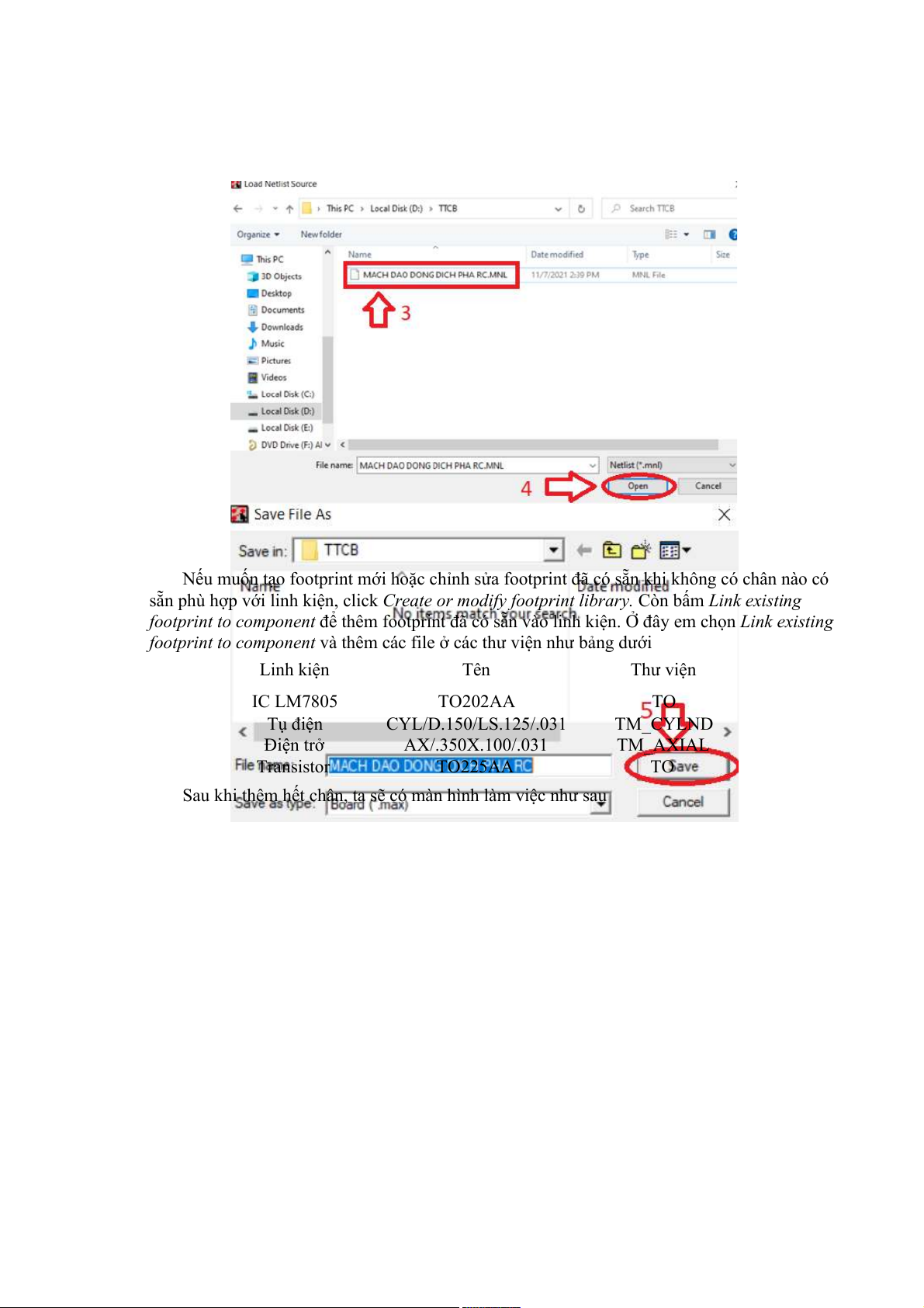 footprint to component và thêm các file ở các thư viện như bảng dưới Linh kiện Tên Thư viện IC LM7805 TO202AA TO Tụ điện CYL/D.150/LS.125/.031 TM_CYLND Điện trở AX/.350X.100/.031 TM_AXIAL Transistor TO225AA TO