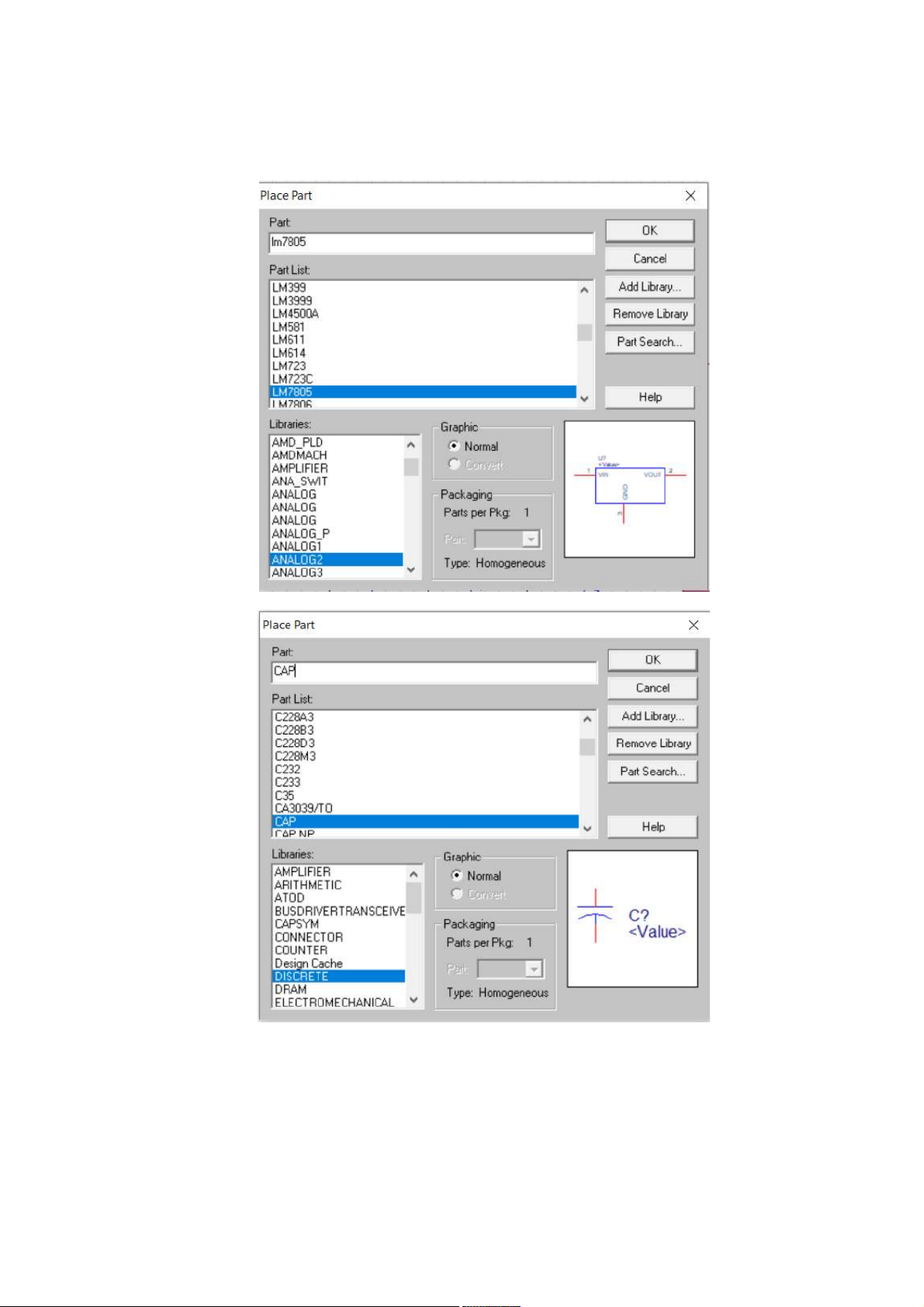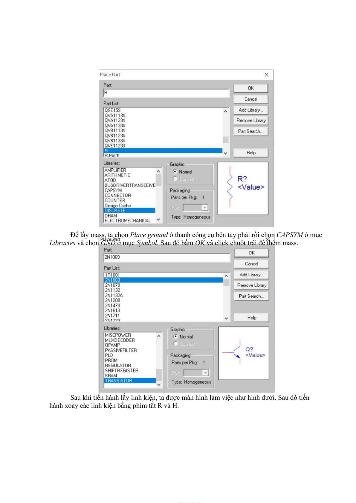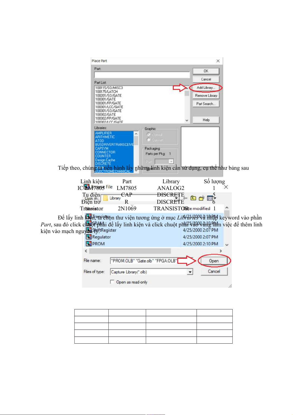 Tiếp theo, chúng ta tiến hành lấy những linh kiện cần sử dụng, cụ thể như bảng sau Linh kiện Part Library Số lượng IC LM7805 LM7805 ANALOG2 1 Tụ điện CAP DISCRETE 5 Điện trở R DISCRETE 6 Transistor 2N1069 TRANSISTOR 1