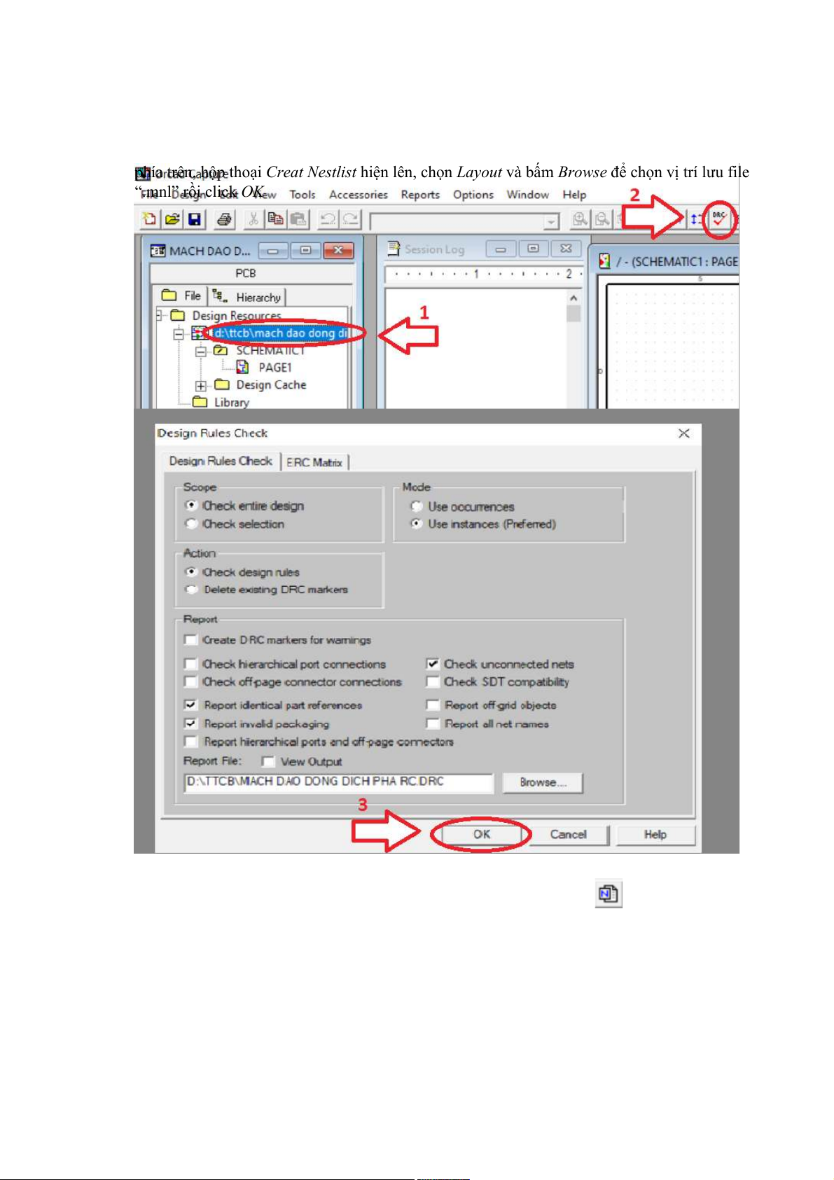 vào file đang thực hiện, sau đó click Design rules check ở thanh công cụ phía trên. Hộp thoại