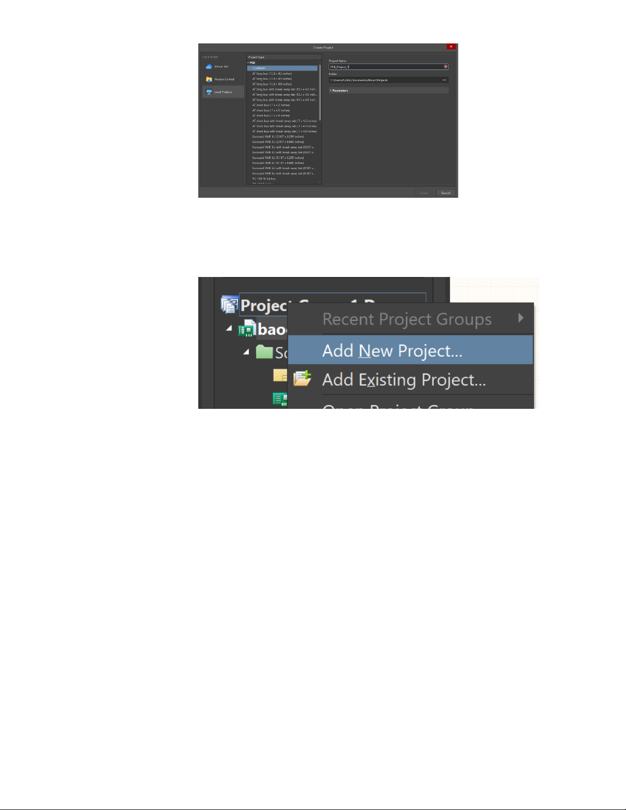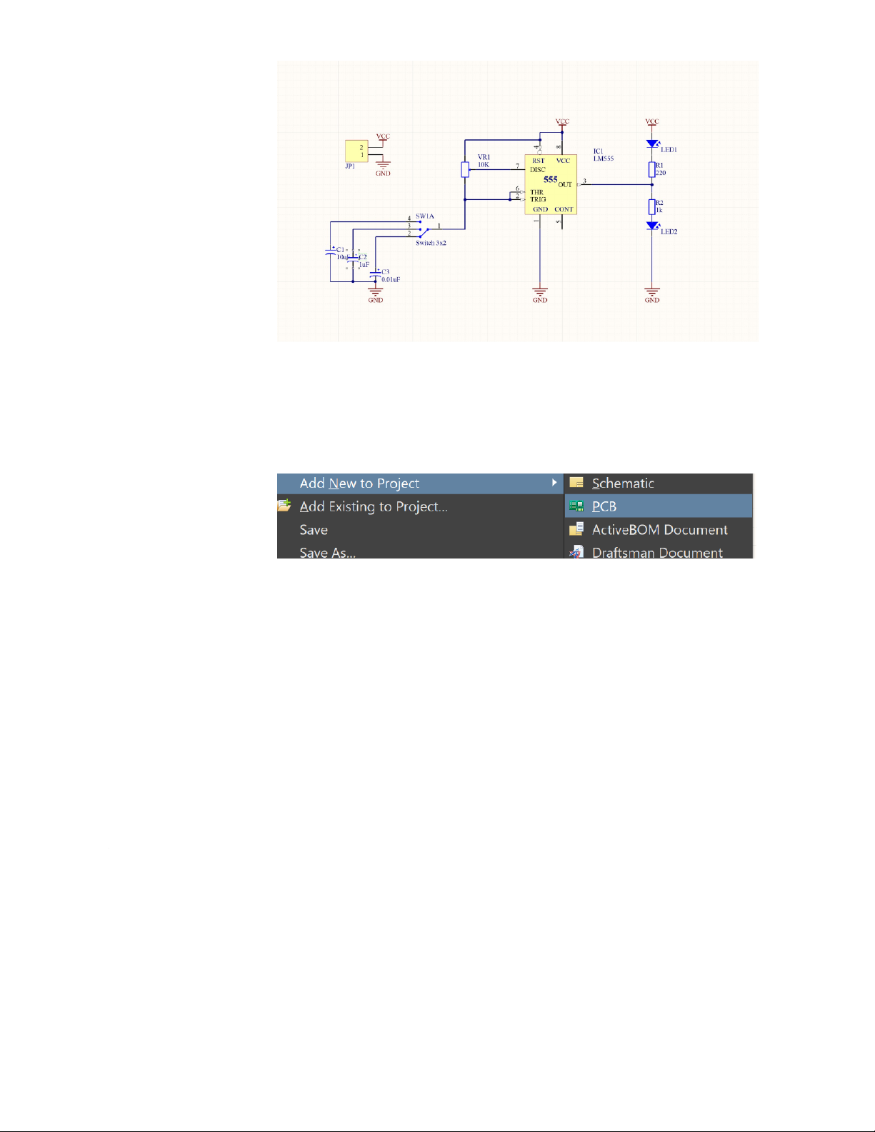 chuột phải vào Project -> Add new Project -> PCB -Sau đó ta Save lại