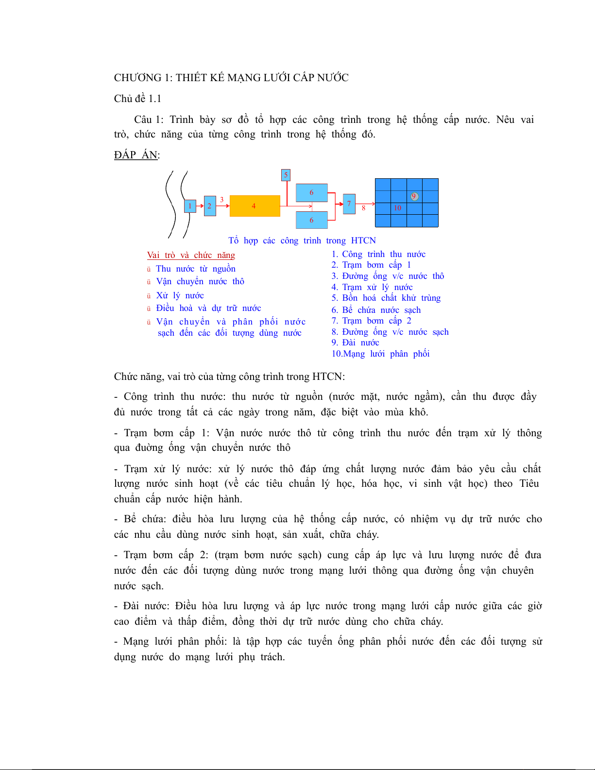Câu 1: Trình bày sơ đồ tổ hợp các công trình trong hệ thống cấp nước. Nêu vai