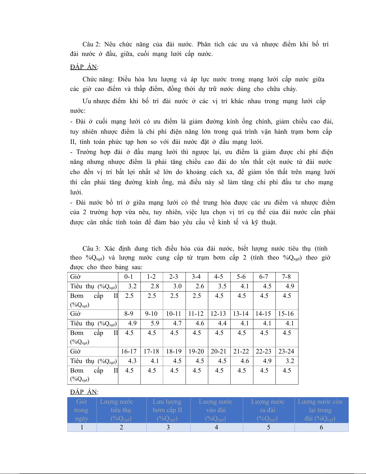 16-17 17-18 18-19 19-20 20-21 21-22 22-23 23-24 Tiêu thụ (%Qngđ) 4.3 4.1 4.5 4.5 4.5 4.6 4.9 3.2 Bơm cấp II 4.5 4.5 4.5 4.5 4.5 4.5 4.5 4.5 (%Qngđ) ĐÁP ÁN: Giờ Lượng nước Lưu lượng Lượng nước Lượng nước