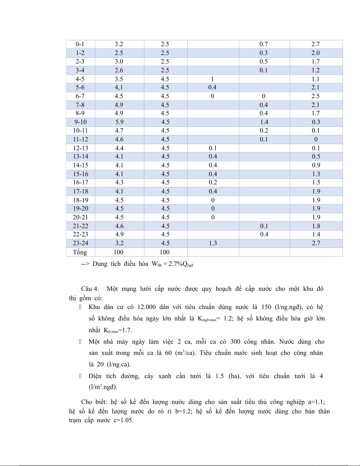 Câu 4: Một mạng lưới cấp nước được quy hoạch để cấp nước cho một khu đô thị gồm có: