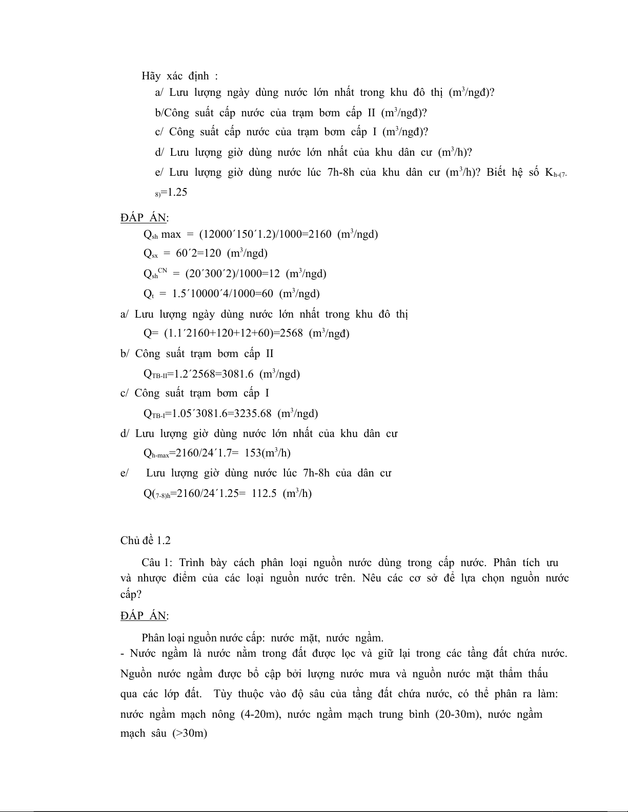 Câu 1: Trình bày cách phân loại nguồn nước dùng trong cấp nước. Phân tích ưu
