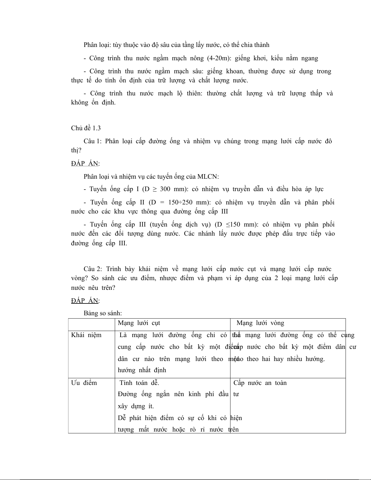 Câu 1: Phân loại cấp đường ống và nhiệm vụ chúng trong mạng lưới cấp nước đô thị? ĐÁP ÁN: