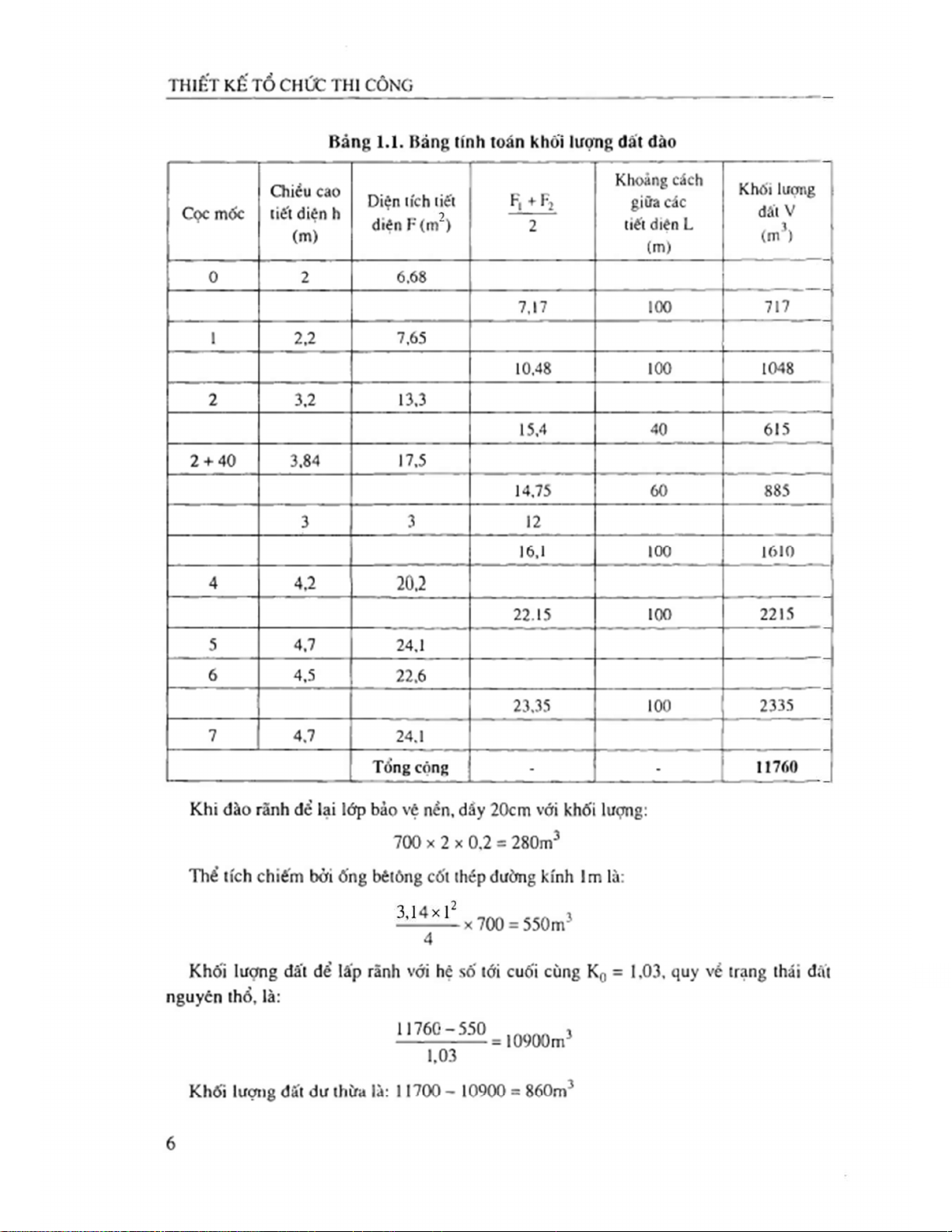 Bảng 1.1. Bảng tính toán khỏi lượng đất đào Khoảng cách Chiều cao Khối lượng Diện tích tiết f ,+ f 2 giữa các Cọc mốc tiết diện h đất V diện F (m ) 2 tiết diện L ( m) ( m 3) ( m ) 0 2 , 6 6 8 7 , 17 100 717 1 2, 2 7 , 65 10 ,48 100 1048 2 3 , 2 13 ,3 15 ,4 40 615 2 + 40 3 , 84 17 5 , 14 7 , 5 60 885 3 3 12 16 ,1 100 1610 4 4, 2 20, 2 22.15 100 2215 5 4 , 7 24 ,1 6 4 , 5 22, 6 23 ,3 5 100 2335 7 4 , 7 24 ,1 Tổng cộng - - 11760