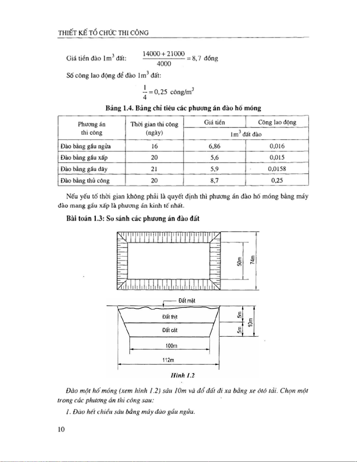 Đào một hô'móng (xem hình 1.2) sâu lOm và đổ đất đi xa bằng xe ôtô tải. Chọn một
