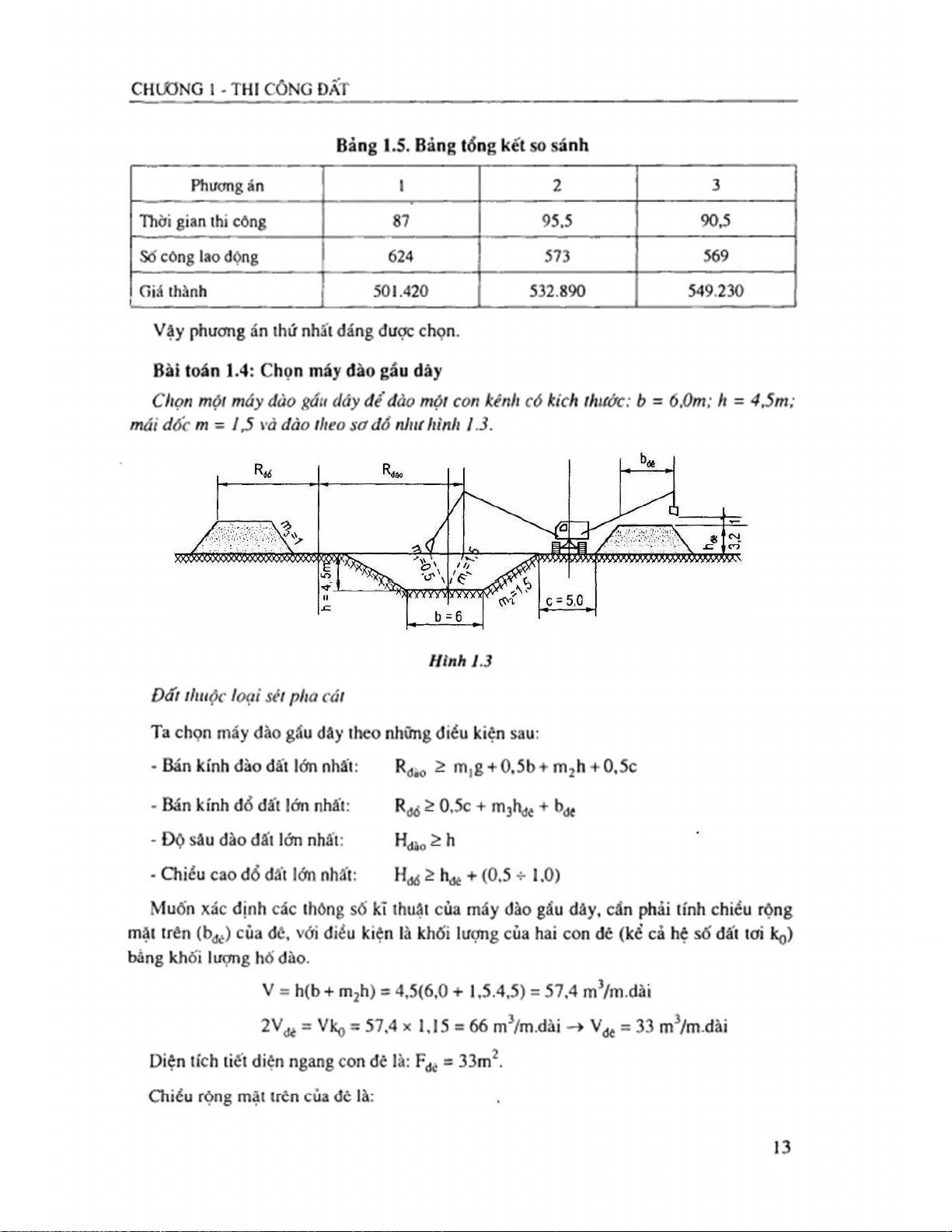 Bảng 1.4. Bảng chỉ tiêu các phương án đào hô móng Phương án Thời gian thi công Giá tiền Công lao động thi công (n gày ) lm 3 đất đào Đào bằng gầu ngửa 16 6 ,8 6 0,016 Đào bằng gầu xấp 20 5 , 6 0,015 Đào bằng gầu dây 21 5 ,9 0,0158 Đào bằng thủ công 20 8 ,7 0 , 25